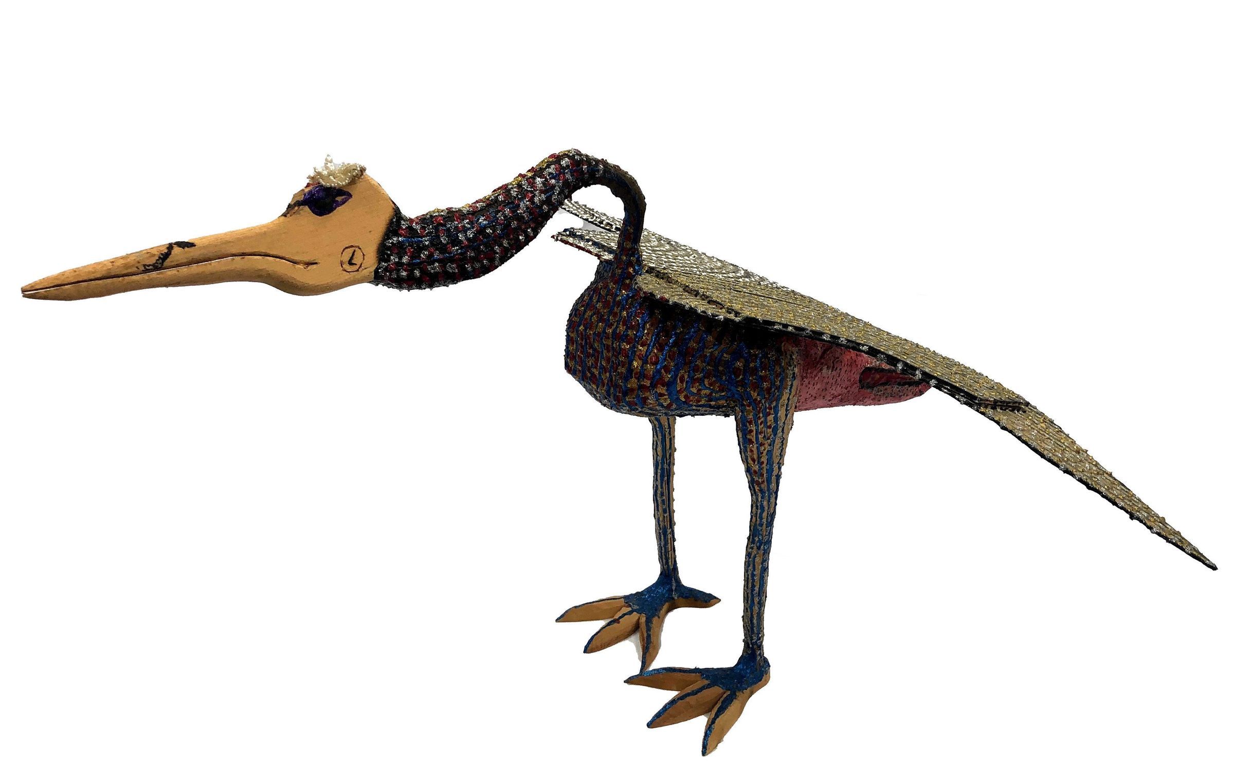 Wooden peacock sculpture created by O.L. Samuels. Consistent glitter paint application and addition of fabric and bead details.Collection