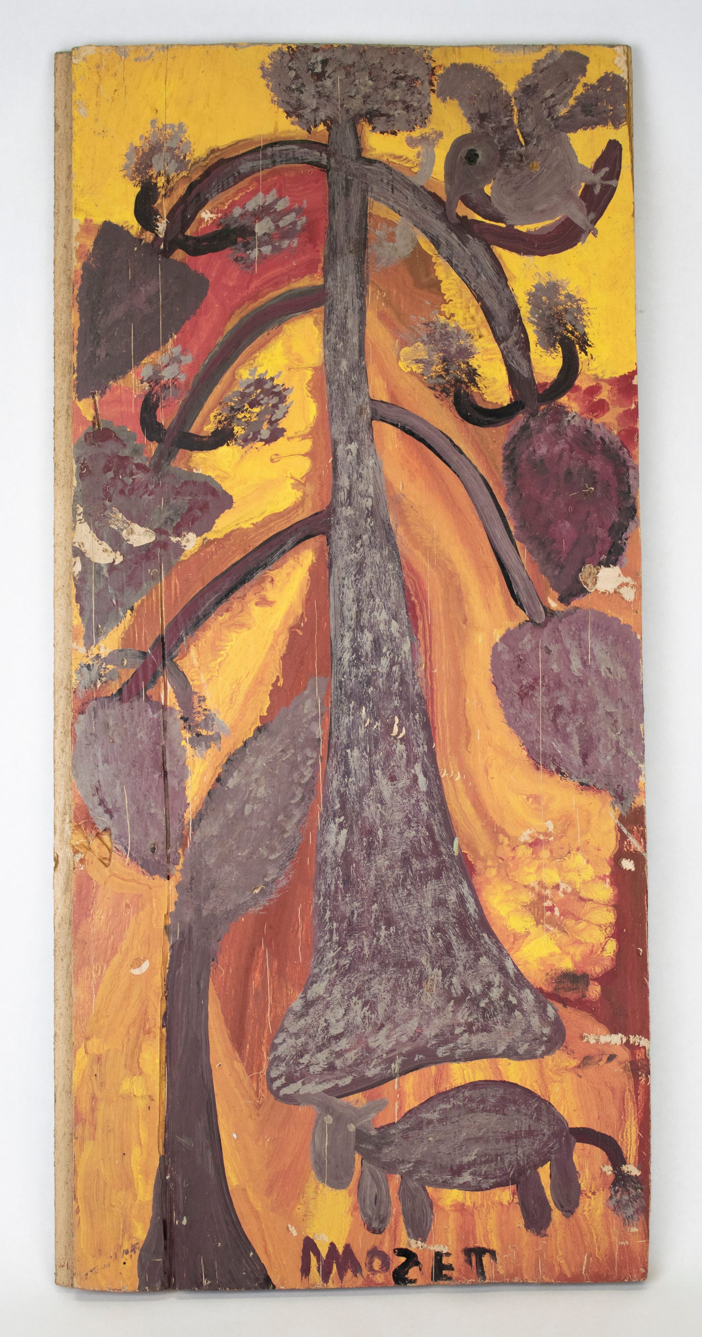 Mose Tolliver depicts two trees, one large central tree and one small tree in the foreground. A bird flies in the upper right corner and a small sheep like creature sits in the bottom right. Executed in reds, oranges, yellows, and purple.Artwork Details