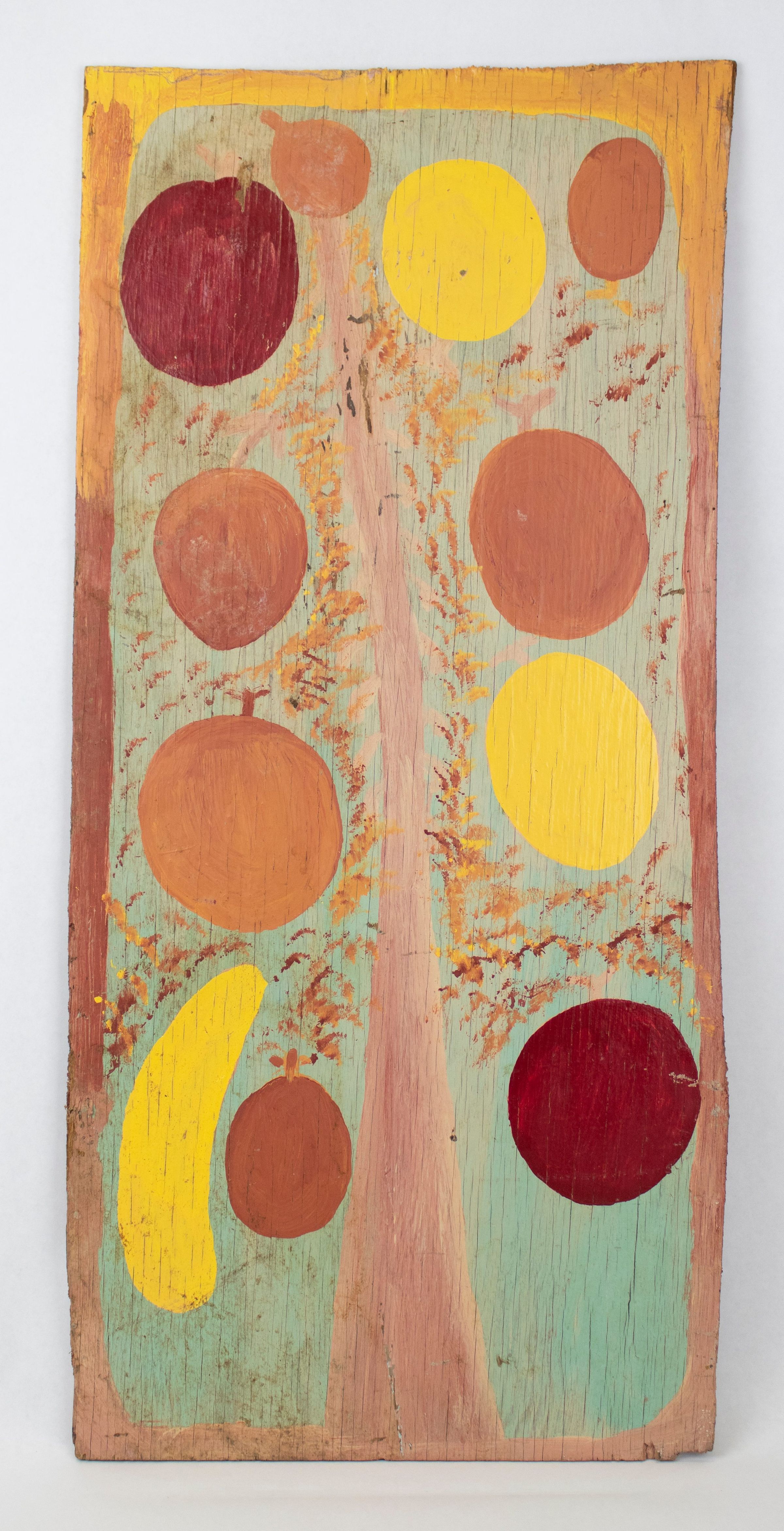 Large central tree depicted in red, yellow, and orange against a light blue background. The artist painted a pink and yellow border around the edge of the wood.