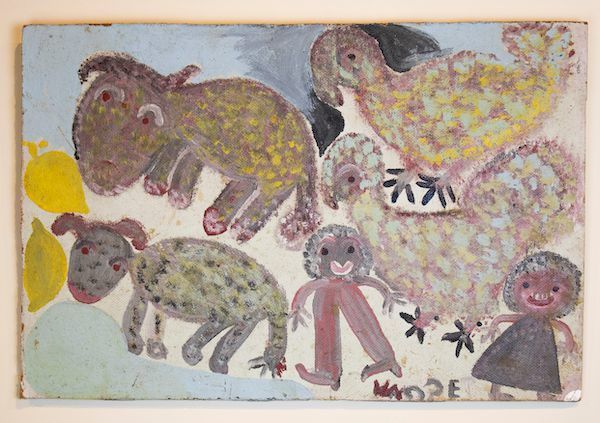 The painting is done on a wood panel that has a textured surface. Depicted is a collection of animals and people. Executed in gray, pink, and yellow.