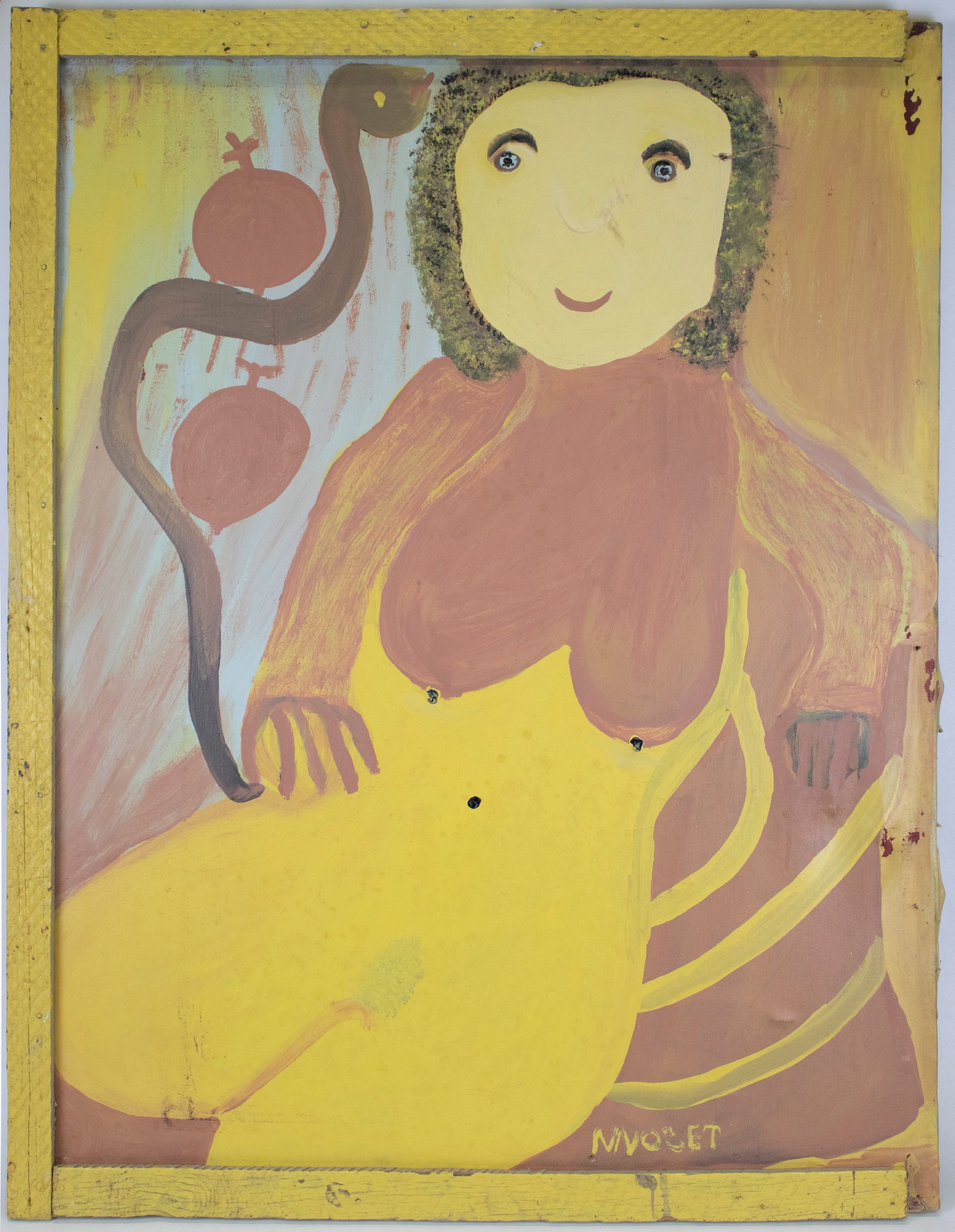 A nude female lounges while a snake floats by her right side and whispers into her ear. Two circular shapes with + or crosses float by. She is executed in yellow and pink on a blue background. A homemade frame was constructed from lath (housing materials) and attached to the sides.