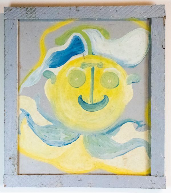 Small yellow figure with blue/green arms and legs. The figure floats in the center of the composition with legs and arms splayed wide. A swirling yellow line encircles the figure. A homemade frame is constructed with 1/2" lath painted gray and attached to front of panel
