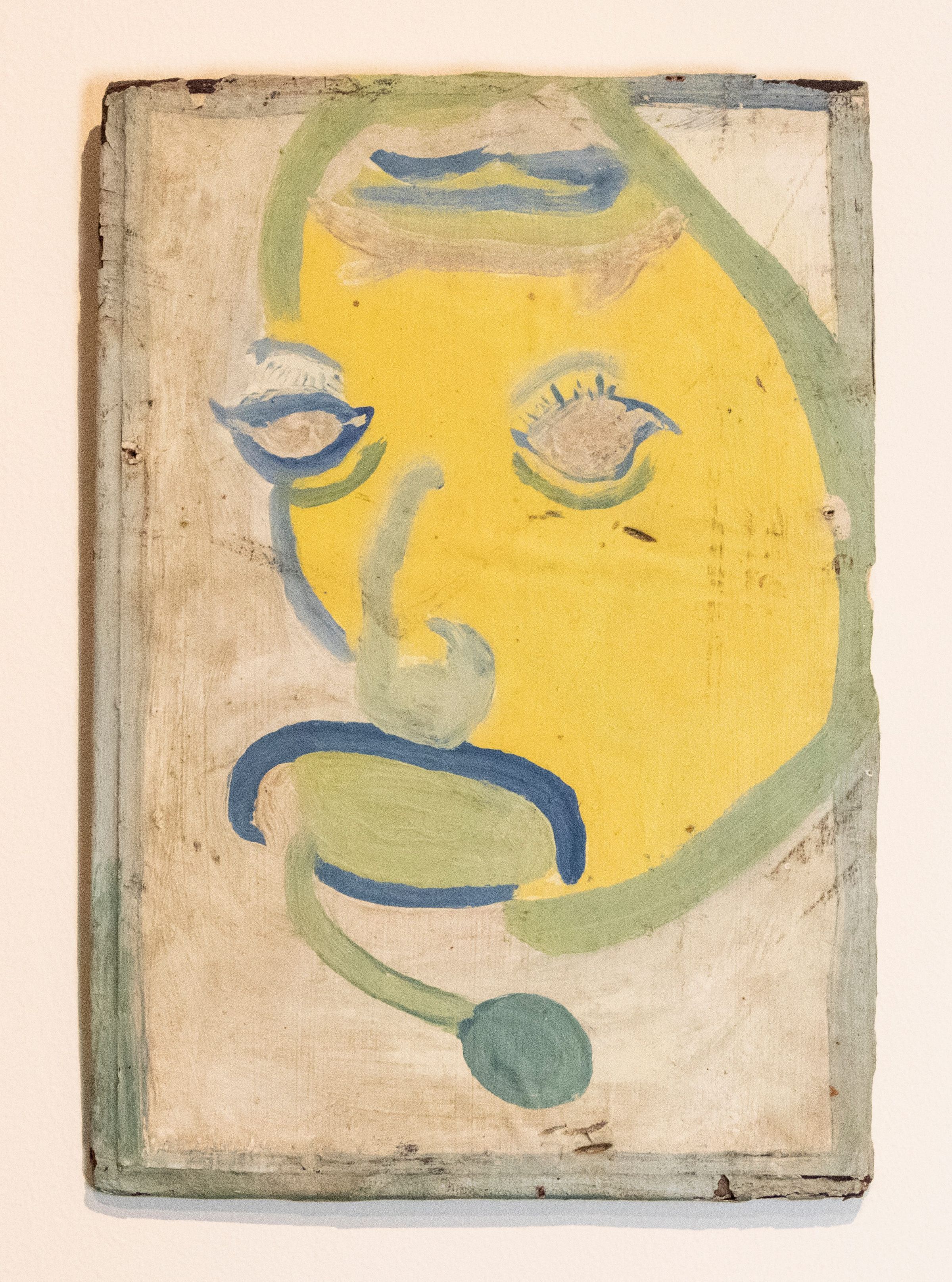 An unusual subject for Tolliver, this floating face has large eyes with eyelashes, eyebrows, and under eye wrinkles, but no pupils. The face is shown in 3/4 profile and a long object is sticking out of its mouth - tongue? Cigar? Pipe? The face is a bright yellow with green/blue outlines.Collection