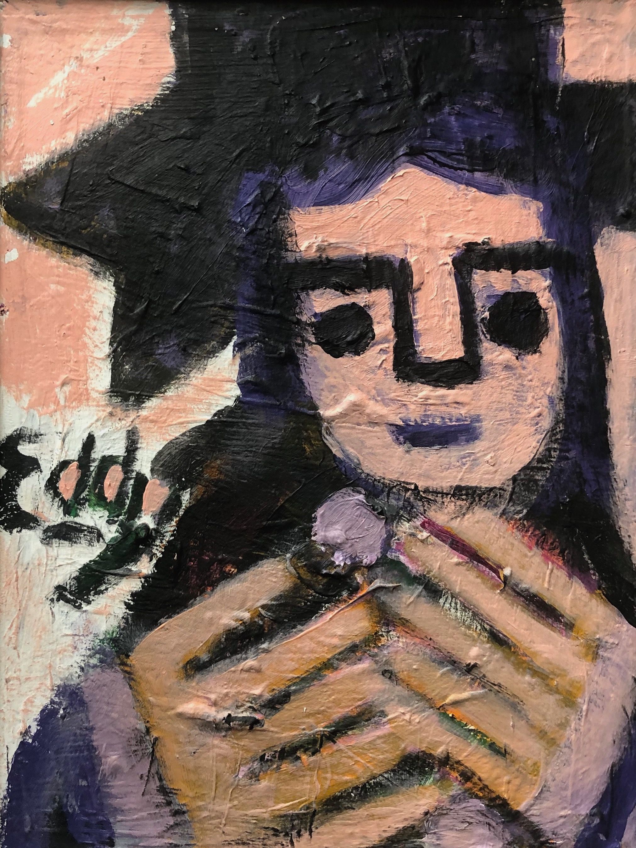 Figure with pink face, purple hair and large black hat.