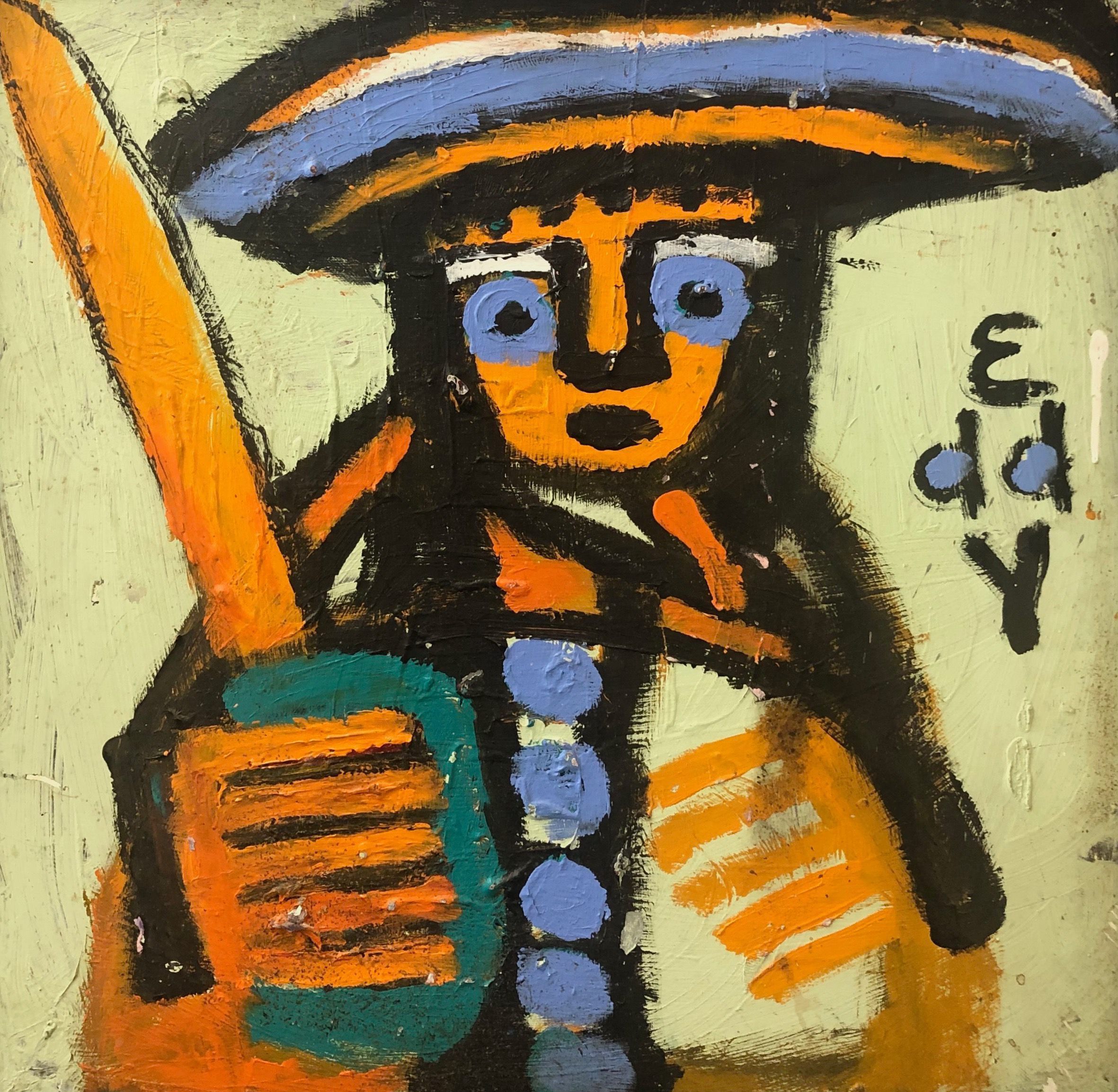 Larger size canvas than usual for Mumma, depicts a sword welding figure with bright blue eyes and large angular hat.