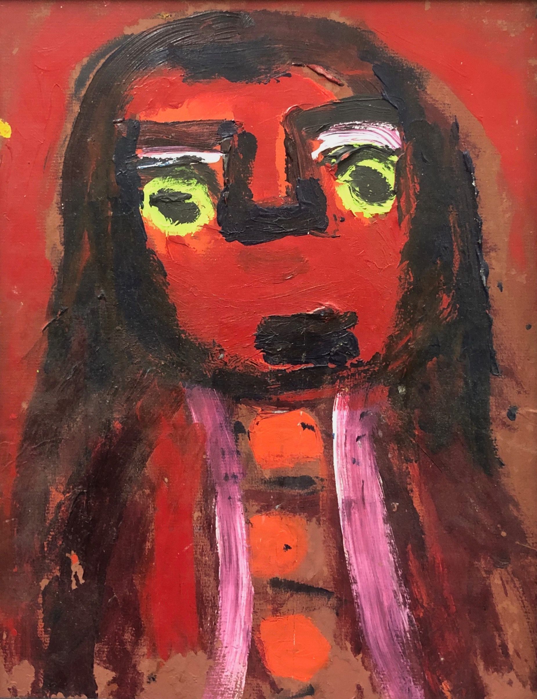 Side 1: Red faced figure with green eyes and long dark hair set against red background, no hands visible. Side 2: Red figure on white background with black hair. No signatures on either side.