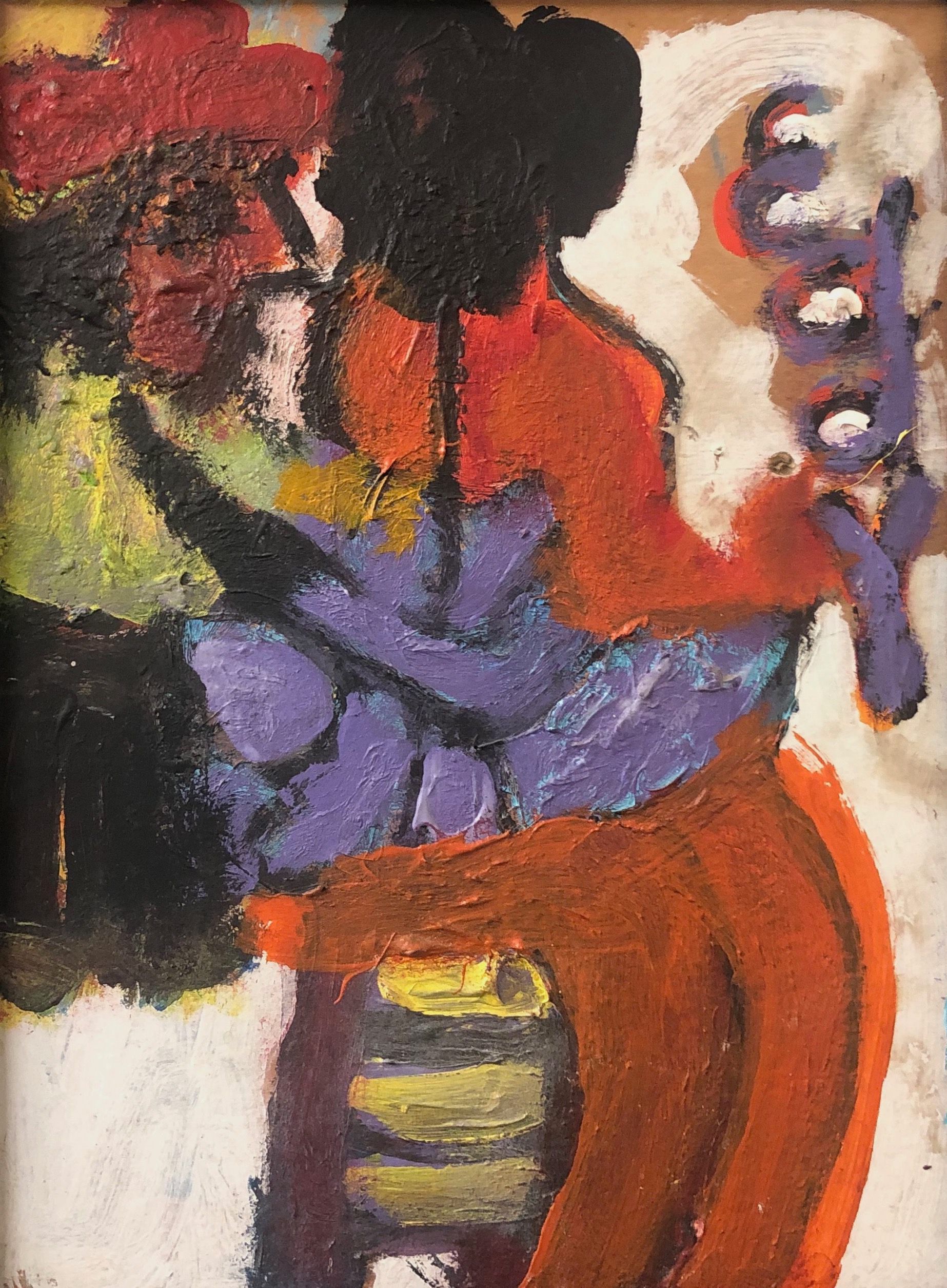 Two figures: one smaller in a red hand, yellow pants, possibly embracing the 2nd figure clad in an orange dress. Perhaps inspired by Toulouse-Lautrec.