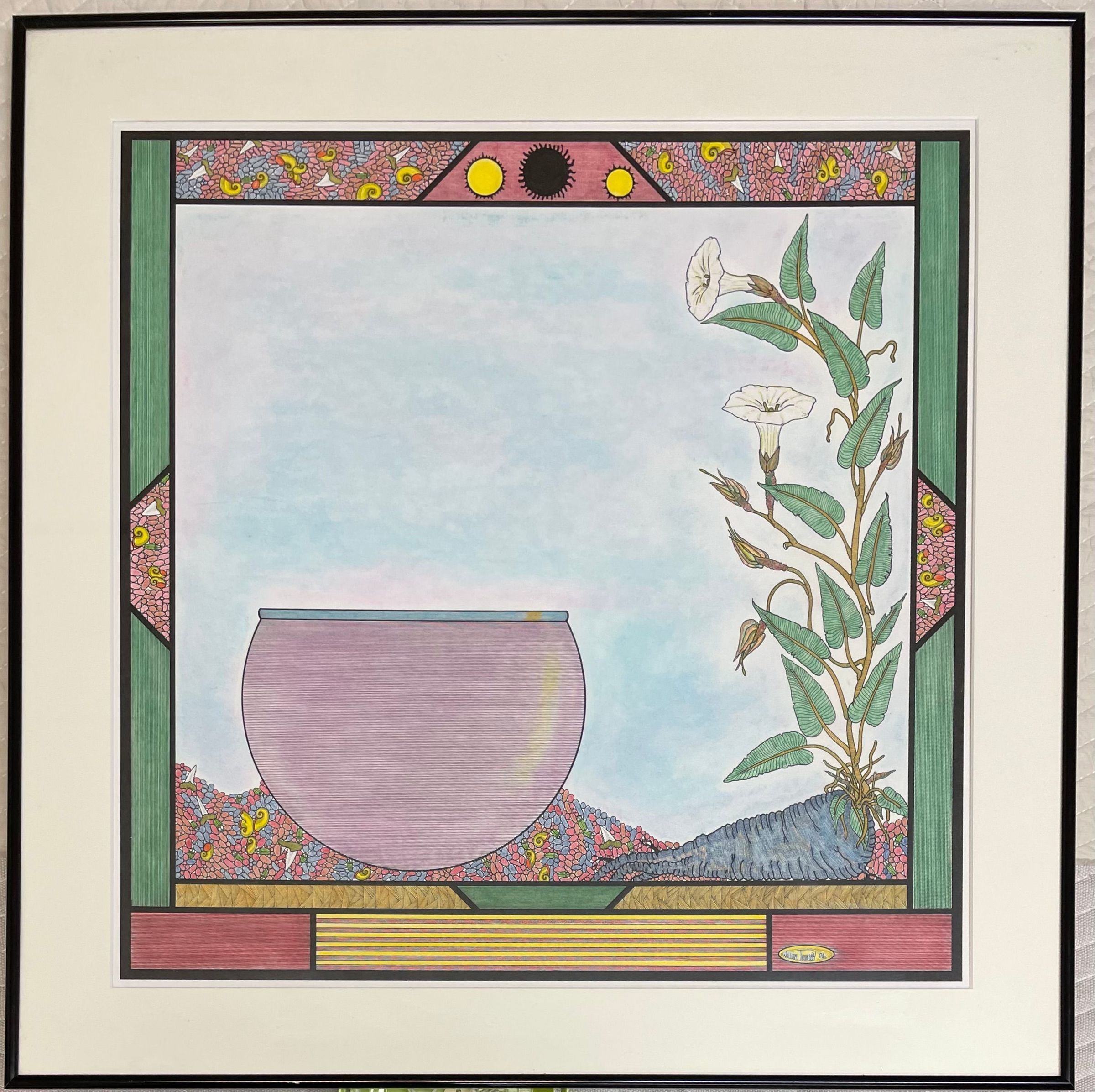This meticulously drafted surrealist still-life painting captures William “Bill” Thursby’s unique artistic and intricate design style. This piece features an uprooted morning glory plant sprouting two blossom flowers and four buds. It has a dark thick root that branches off into the rocky soil beneath. Its outreached petals face three suns—two yellow and one black—depicted in the border, taking up the majority of the composition. In the language of flowers, the morning glory is a symbol of strength, used to give someone the power to realize their hopes and dreams. The scene is framed in an intricately designed border in reds, yellows, and greens. Small hidden treasures of yellow seashells, shark teeth, and green beetles are found amongst the rocks. A large purple vase with light blue trim sits nestled in the rocks, and is arguably the least dynamic object of the piece. The contrast between the complex designs of the border and flower to the subdued design of the pot makes it stand out. Which begs the question, what is the pot’s purpose? Due to the adjacent position, it could be inferred that the pot once held the morning glory.Artwork Details
