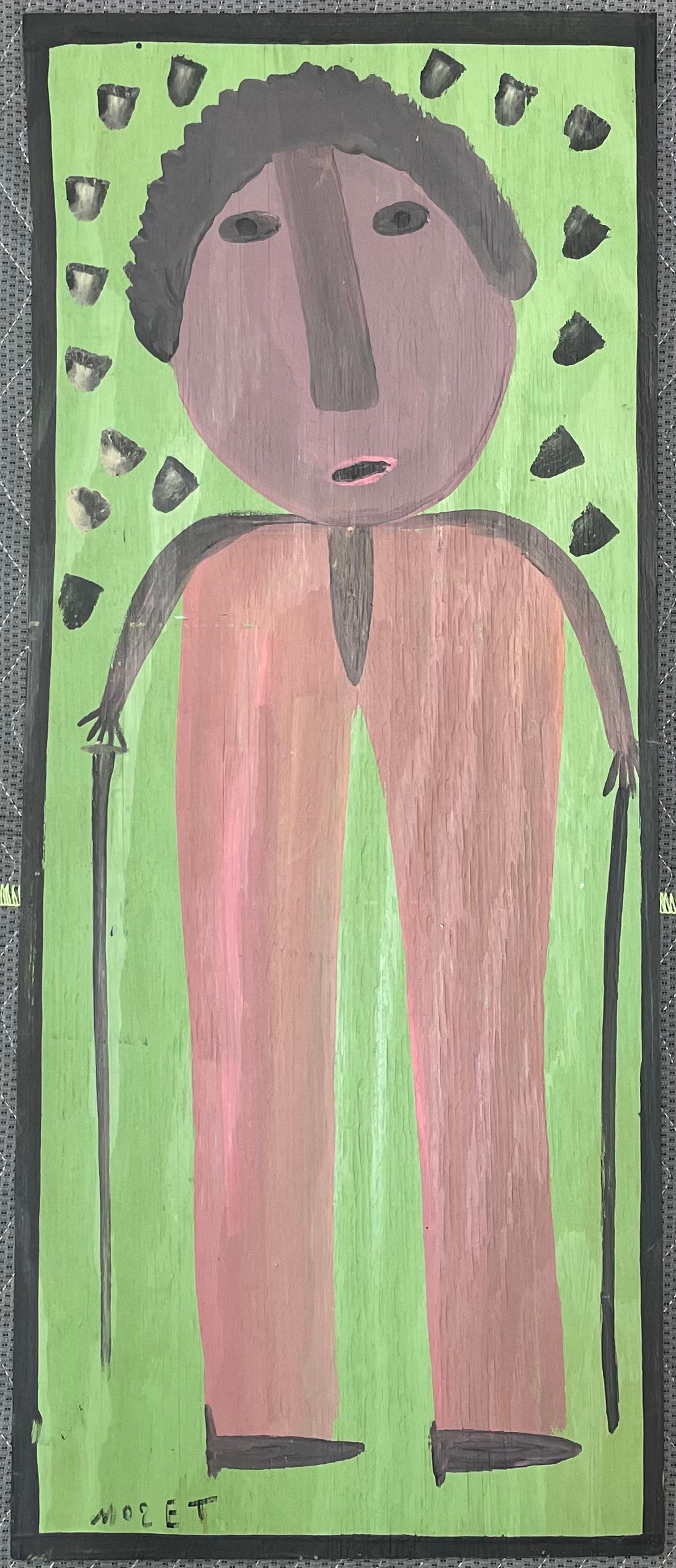 This painting is most likely a self-portrait by Mose Tolliver after a 1977 work accident that crushed his legs. Tolliver repeats this image often in his work from the 1980s. Tolliver portrays a static figure staring at the viewer, mouth agape. The figure’s legs make up a majority of the painting, signifying the importance of mobility for the artist. The figure holds two twig-like canes by his sides. The exaggerated proportions of the figure’s large head and thin arms compared to his legs makes it appear as if he is barely able to hold himself up.Collection