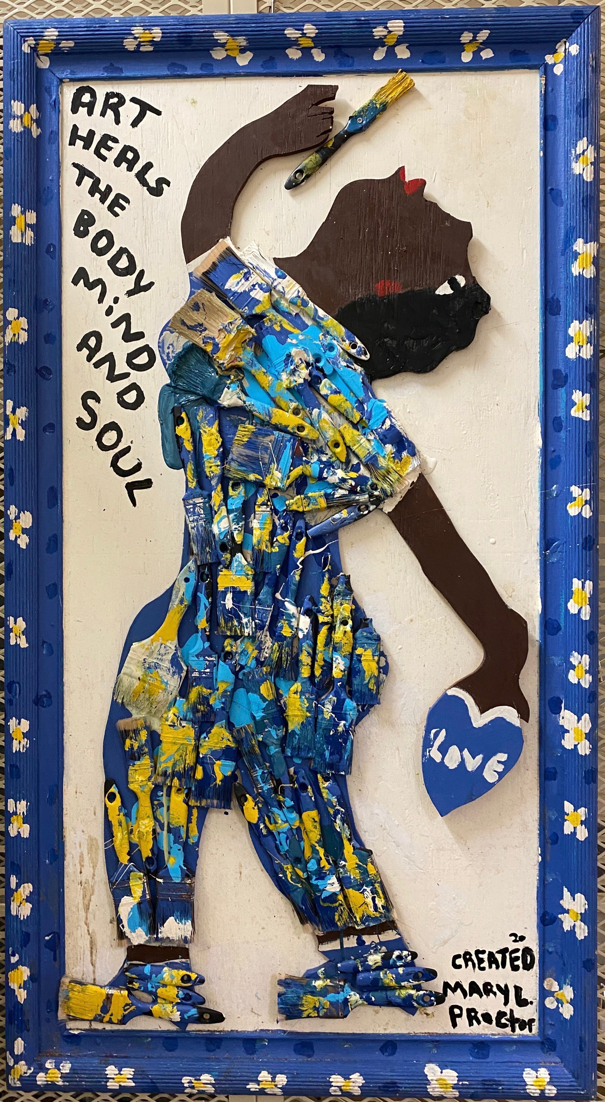This mixed media portrait by Folk artist Mary L. Proctor utilizes wood and paintbrushes to create the composition. The figure embodies artmaking while seemingly painting the portrait we’re looking at. The figure leans back elegantly with her head tilted towards the sky. In her right hand, she holds a brush up to the edge of the frame, as if she is painting the white and yellow flowers surrounding her. Her left hand holds a heart with “love” written inside, while “art heals the body mind and soul” is written within the frame next to the figure, emphasizing the love Proctor has for art. Proctor layered brushes of different sizes and shapes, and painted in shades of blue and yellow to create the figure’s clothing and shoes. For Proctor, putting together items that are unwanted or broken represents the process of mending.