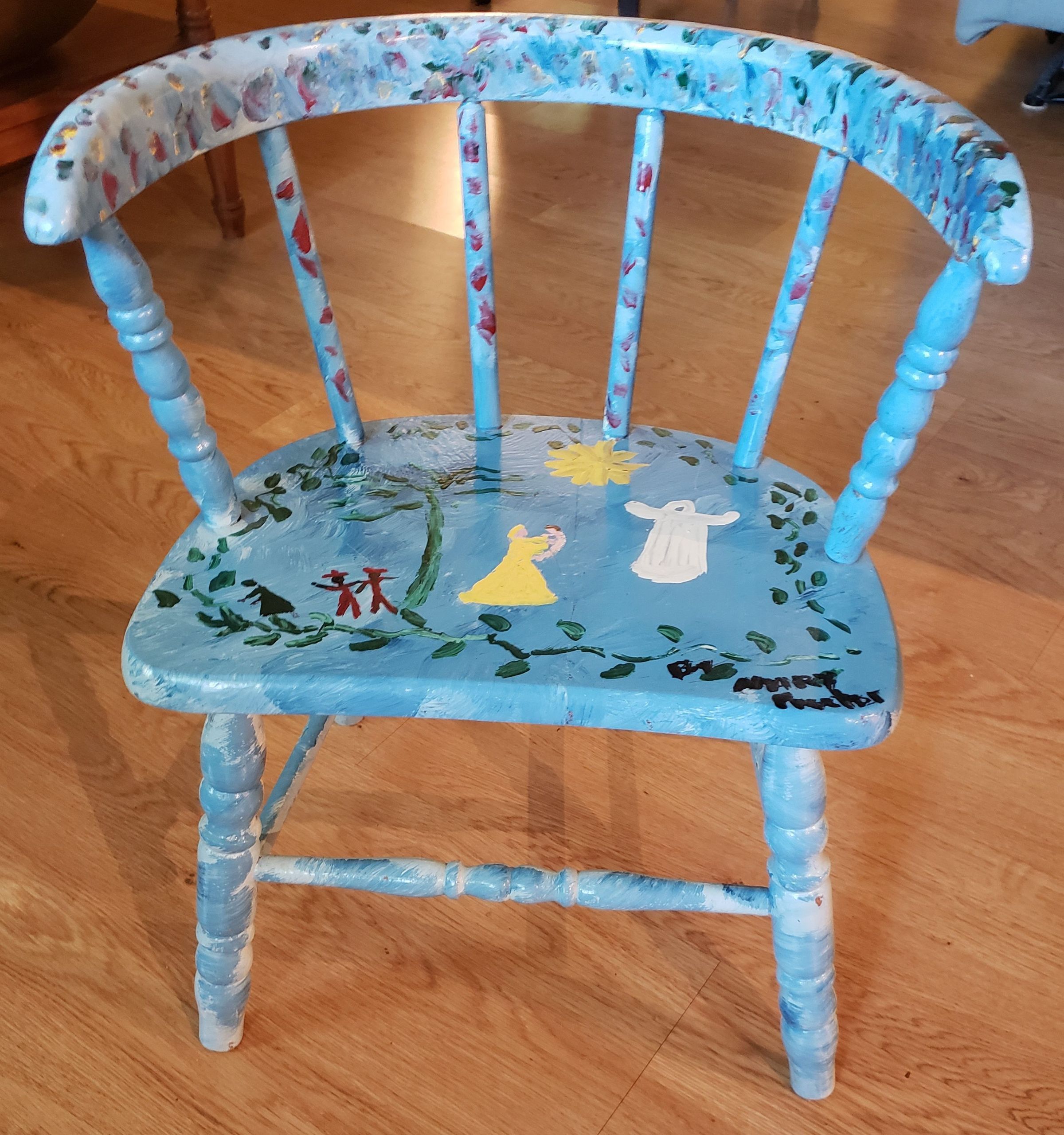 This painted child's chair by Mary L. Proctor features shades of blue paint on a child's wooden chair. On the seat of the chair, Proctor painted six figures. A figure in a flowing yellow dress holds up an unclothed child high above her head. To their right, a floating angel figure donned in white gazes down upon the figures.