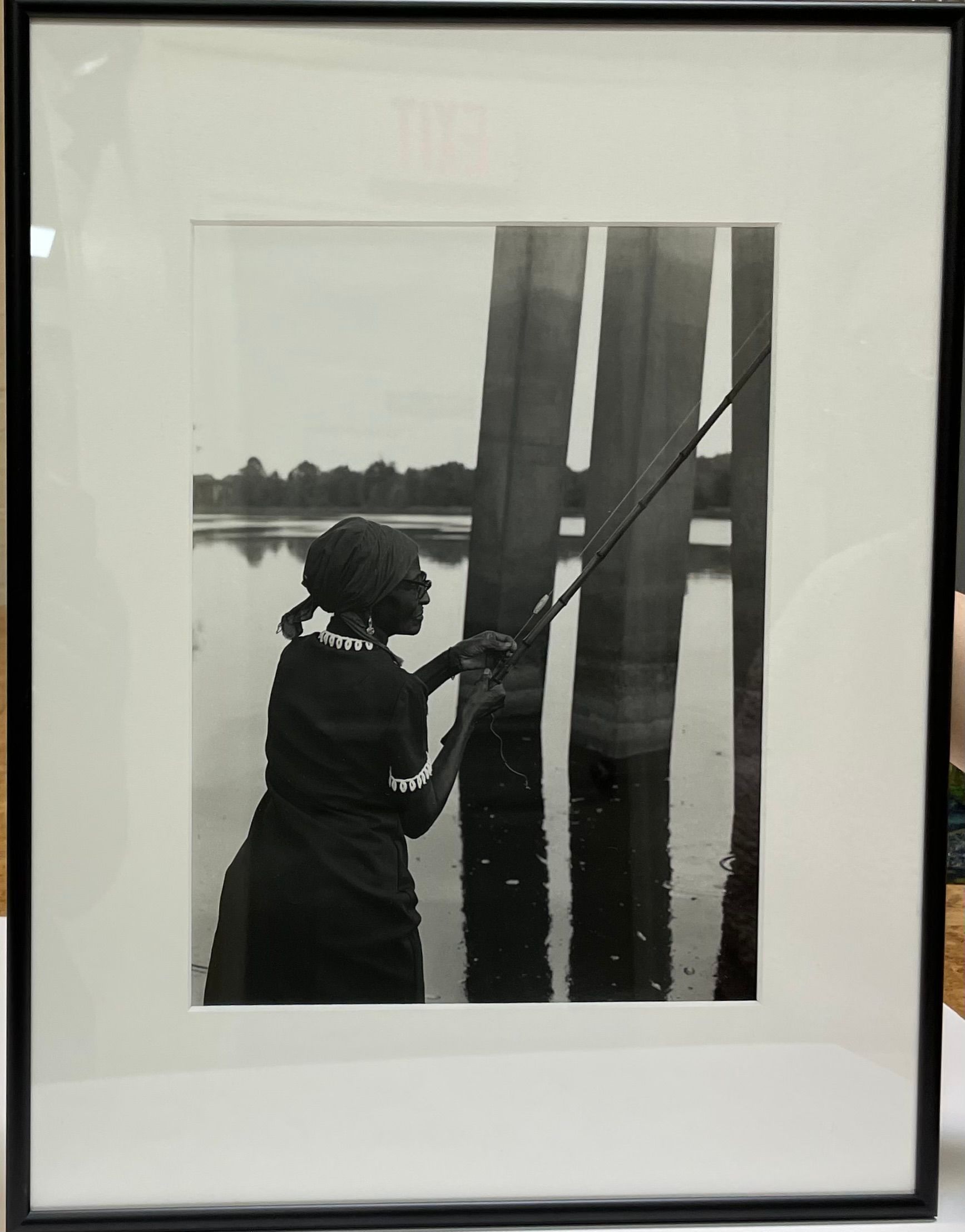 Black and white silver gelatin photographic print of a woman casting a fishing pole. Landscape in the background indicates she may be under a bridge. The photograph was taken in 1980 but first printed in 2021. This is the 5th of 25 edition.
