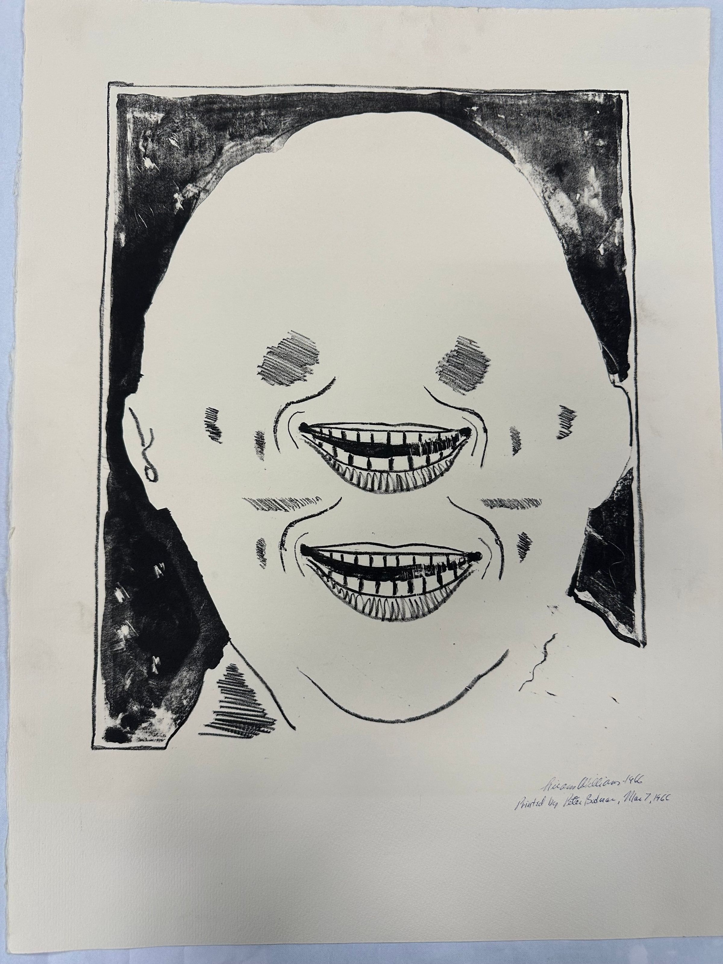 Black and white portrait of Williams with two smiling mouths. Signed lower right corner, "Hiram Williams 1966, Printed by Peter Boduar, May 7, 1966"Type of Print
