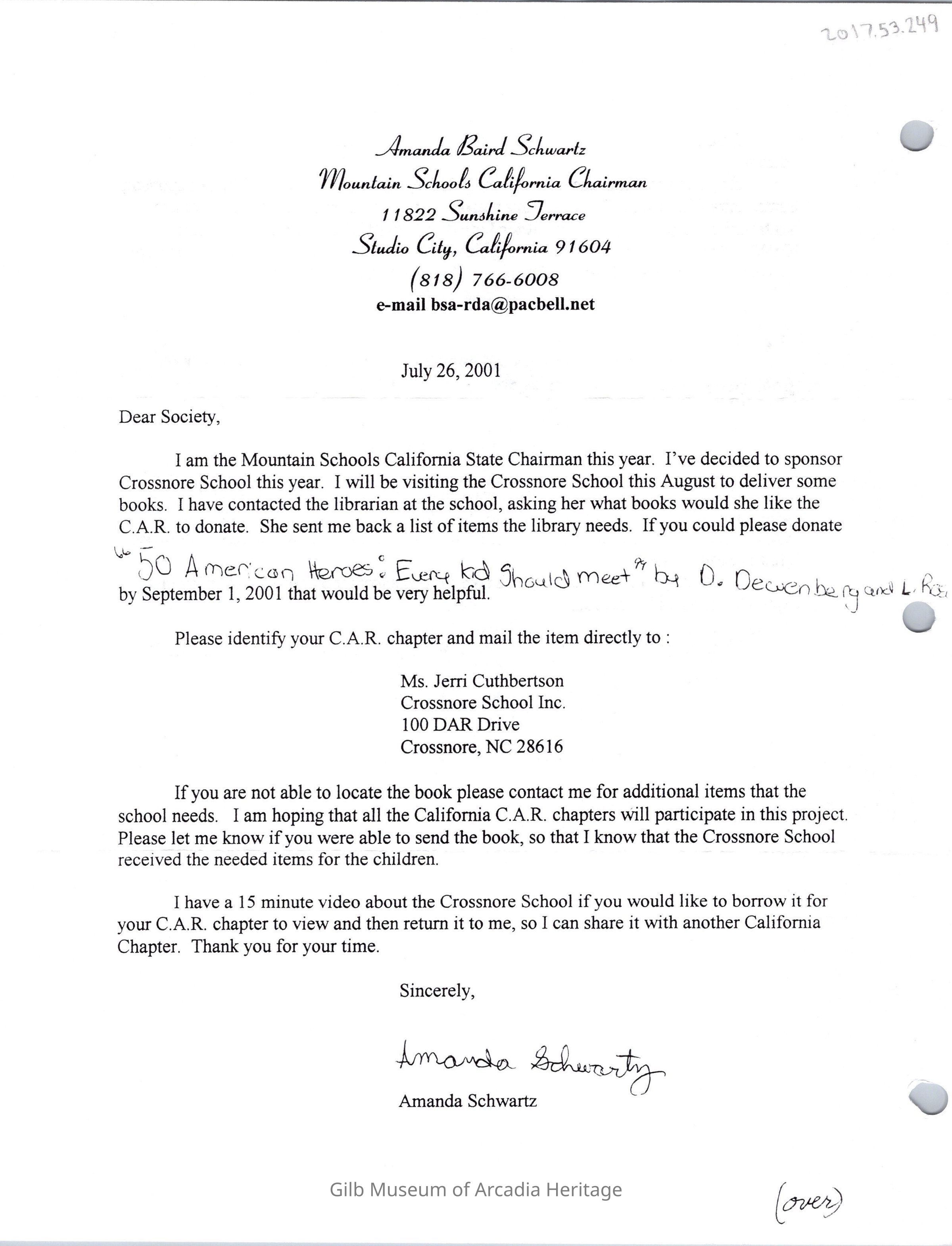 An Email from Amanda Schwartz talking about sponsoring Crossnore School.Collection