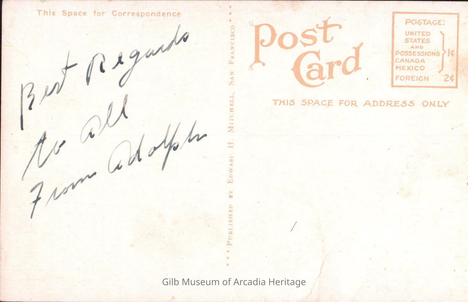 Front of postcard: Rows of orange trees with a snow covered mountain in the background.Collection