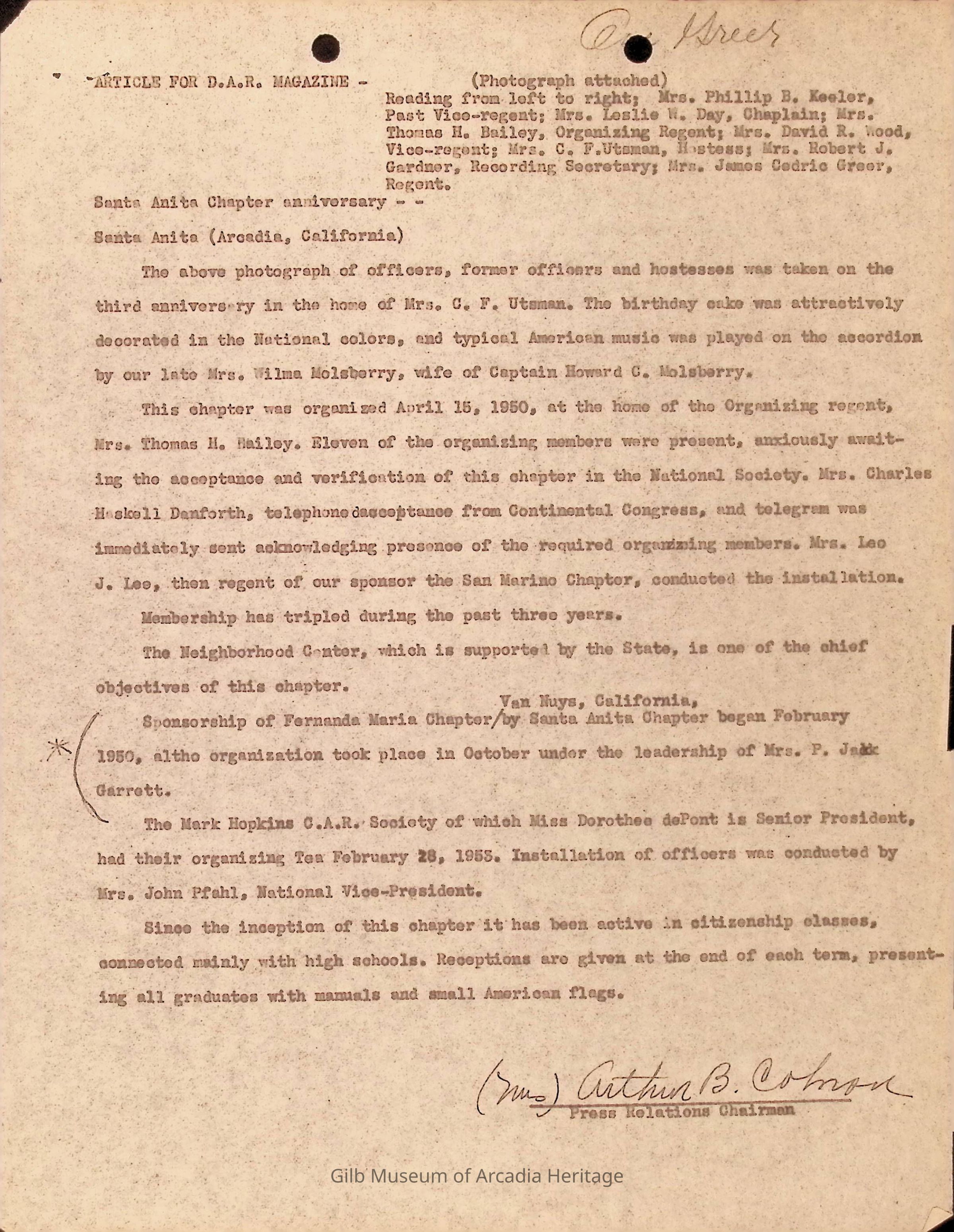 Article For D.A.R. Magazine about the founding of the Santa Anita Chapter in 1950.Collection