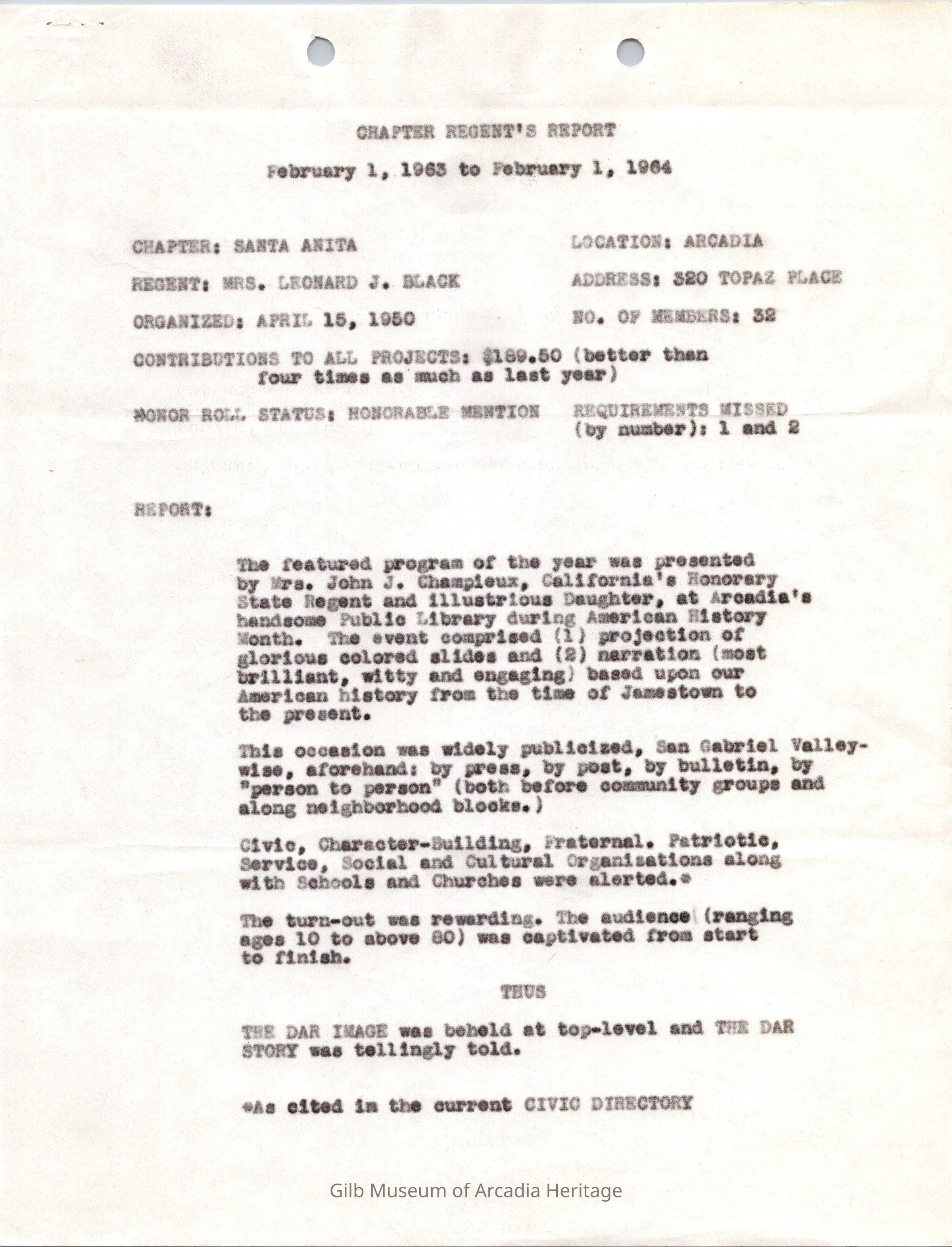 Chapter Regent's Report 1963-1964