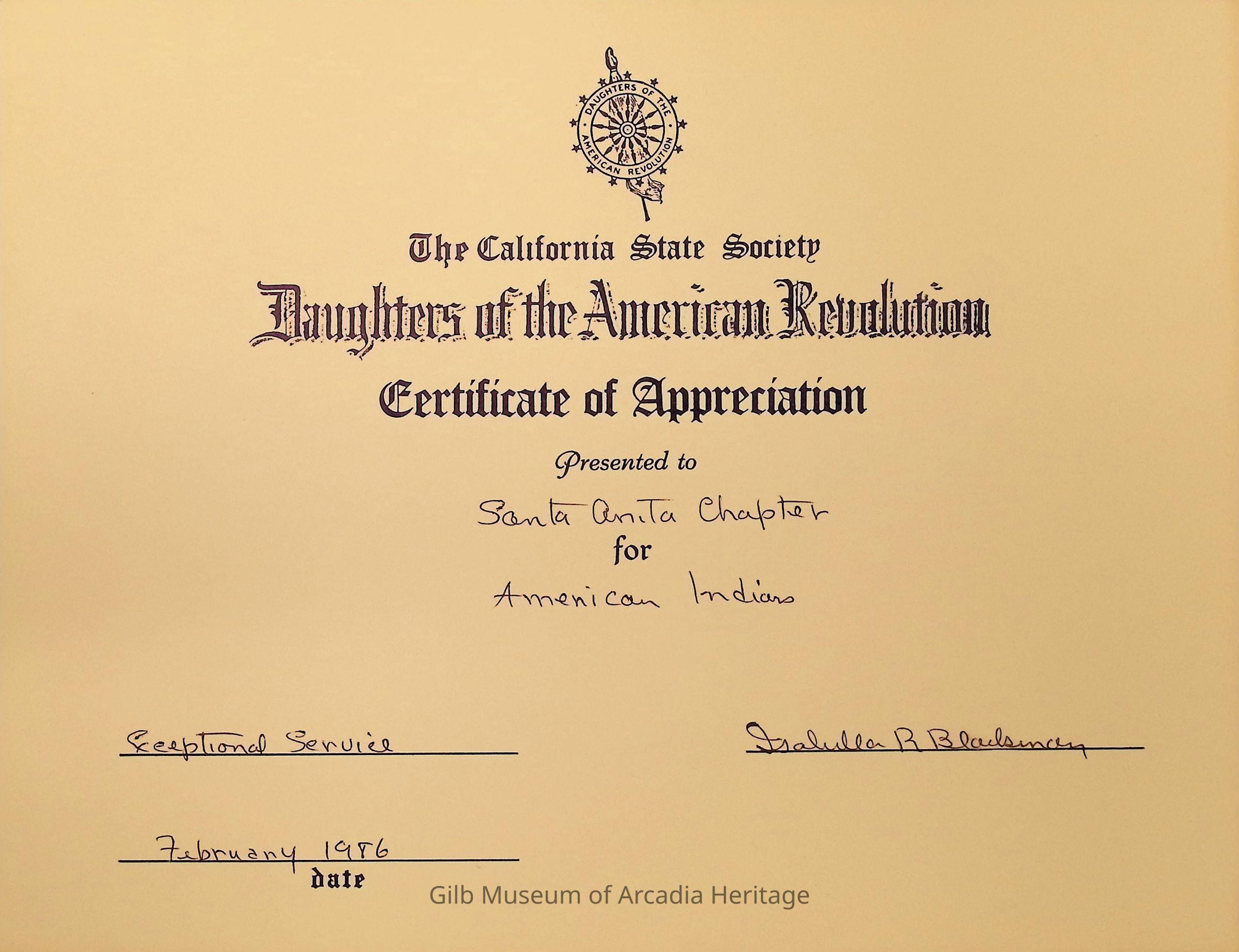 CSS DAR Certificate of Appreciation for American IndiansEntry/Object ID