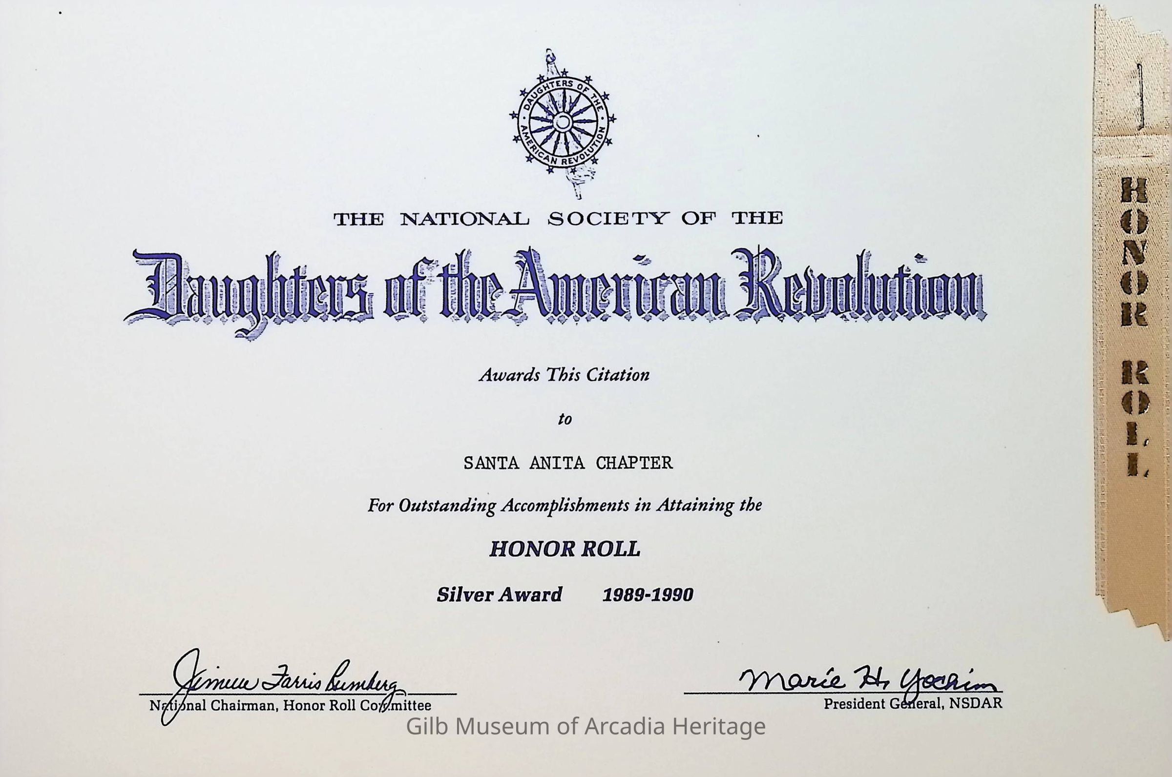 Daughters of the American Revolution Chapter Santa Anita Silver Honor Roll Award in 1989-1990