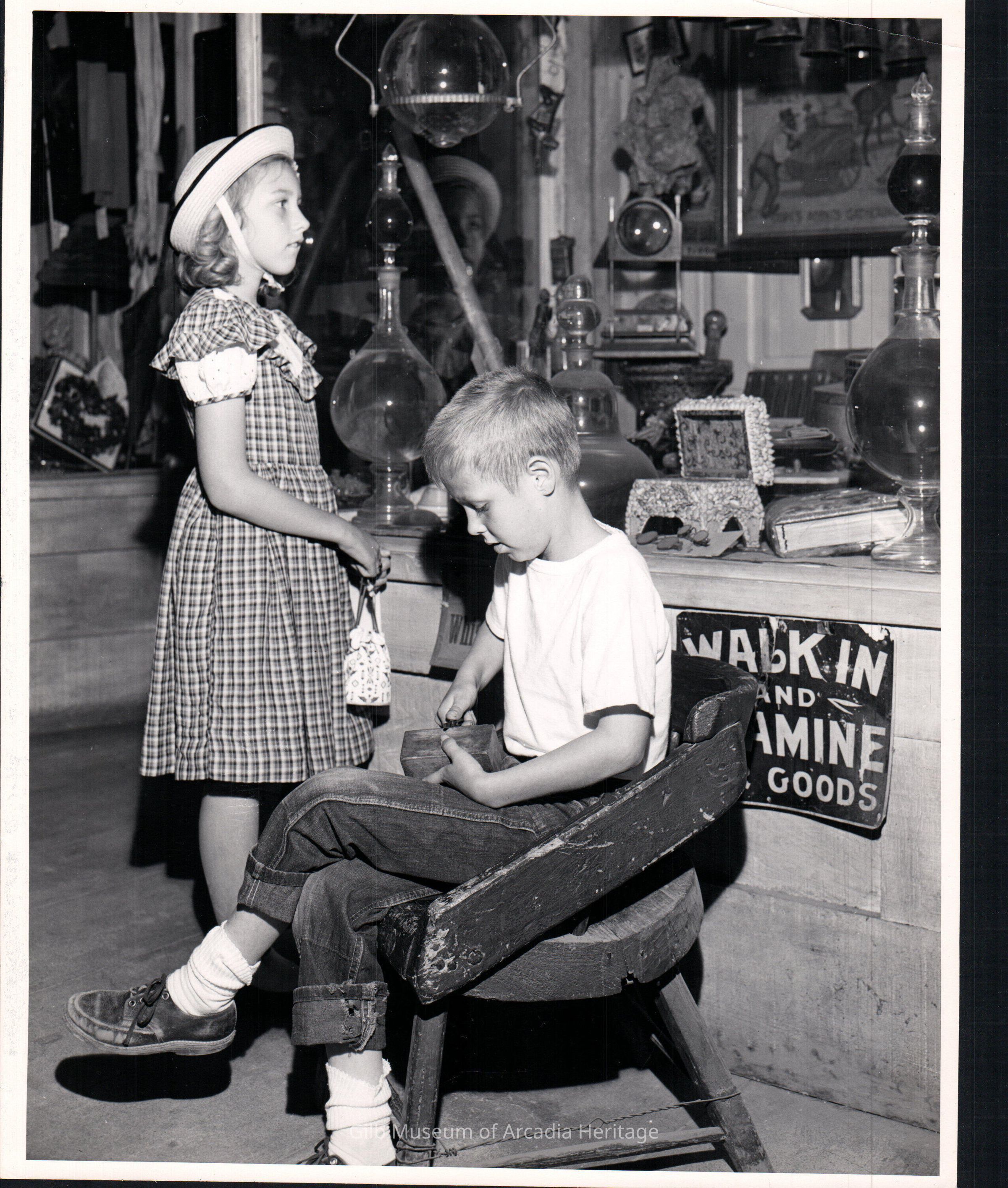 A young boy sits carving while a young girl looks at a display at the Pony Express Museum in Arcadia, CA.Collection