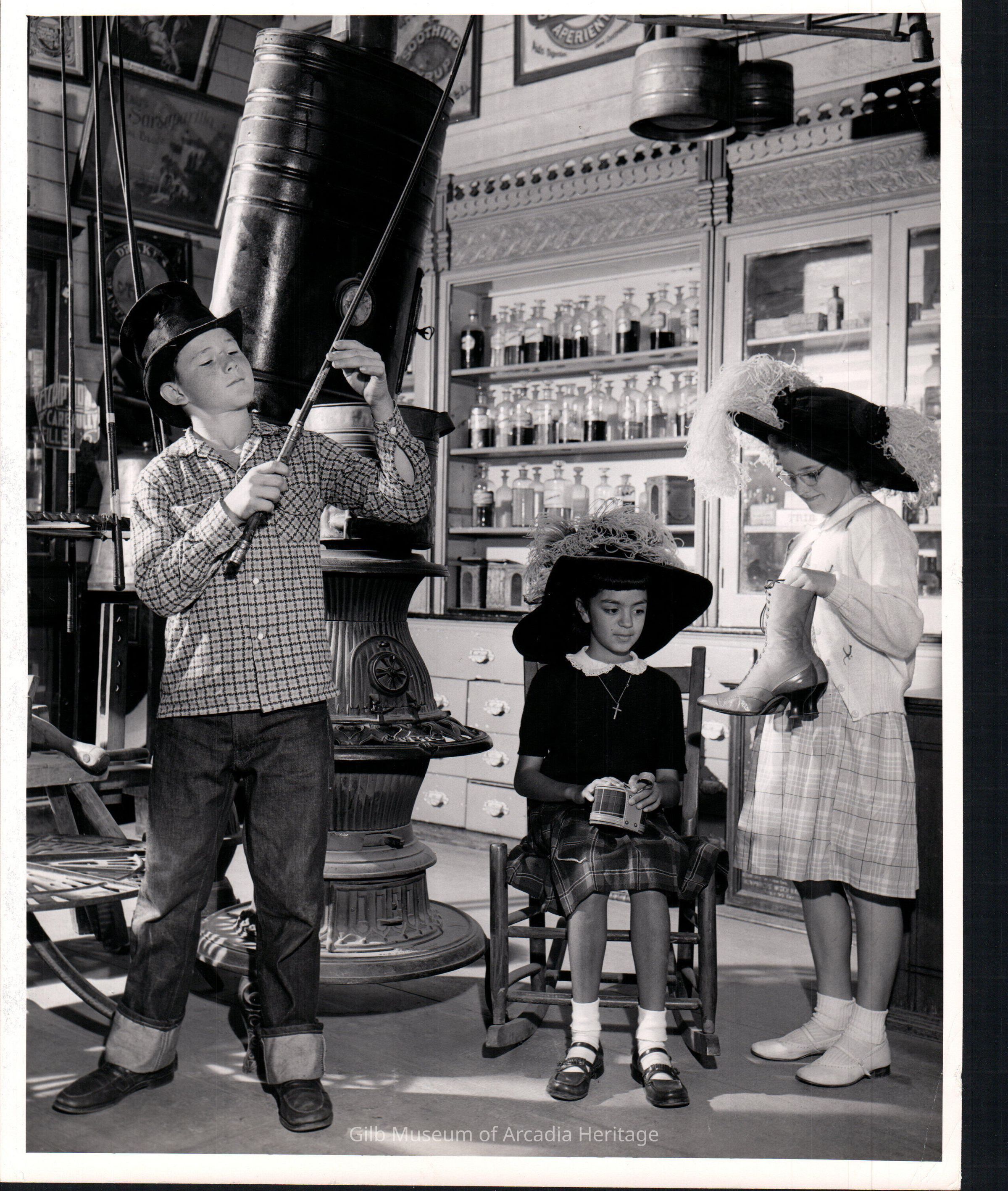A boy and two girls pose with various objects at a display at the Pony Express Museum in Arcadia, CA.Collection