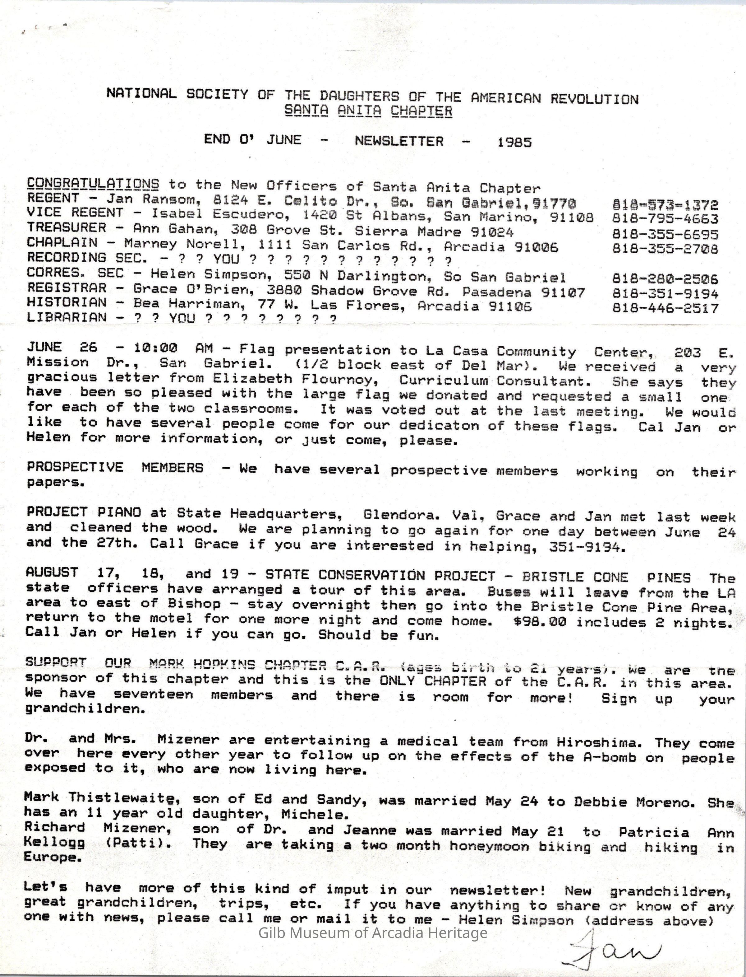 DAR: Santa Anita Chapter NSDAR End O' June 1985 NewsletterEntry/Object ID
