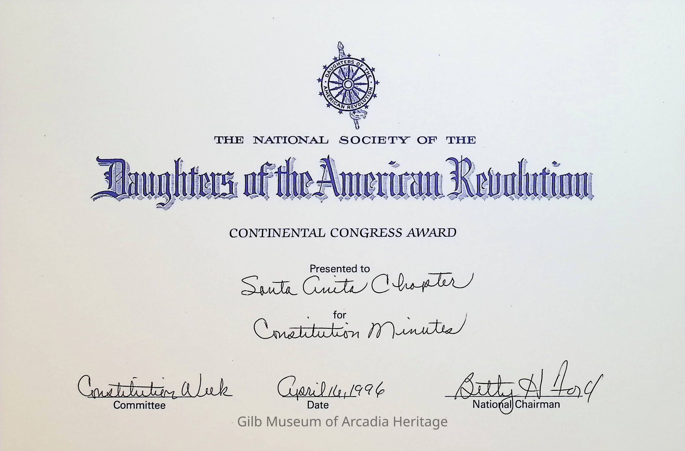 Daughters of the American Revolution Chapter Santa Anita Continental Congress Award in 1996