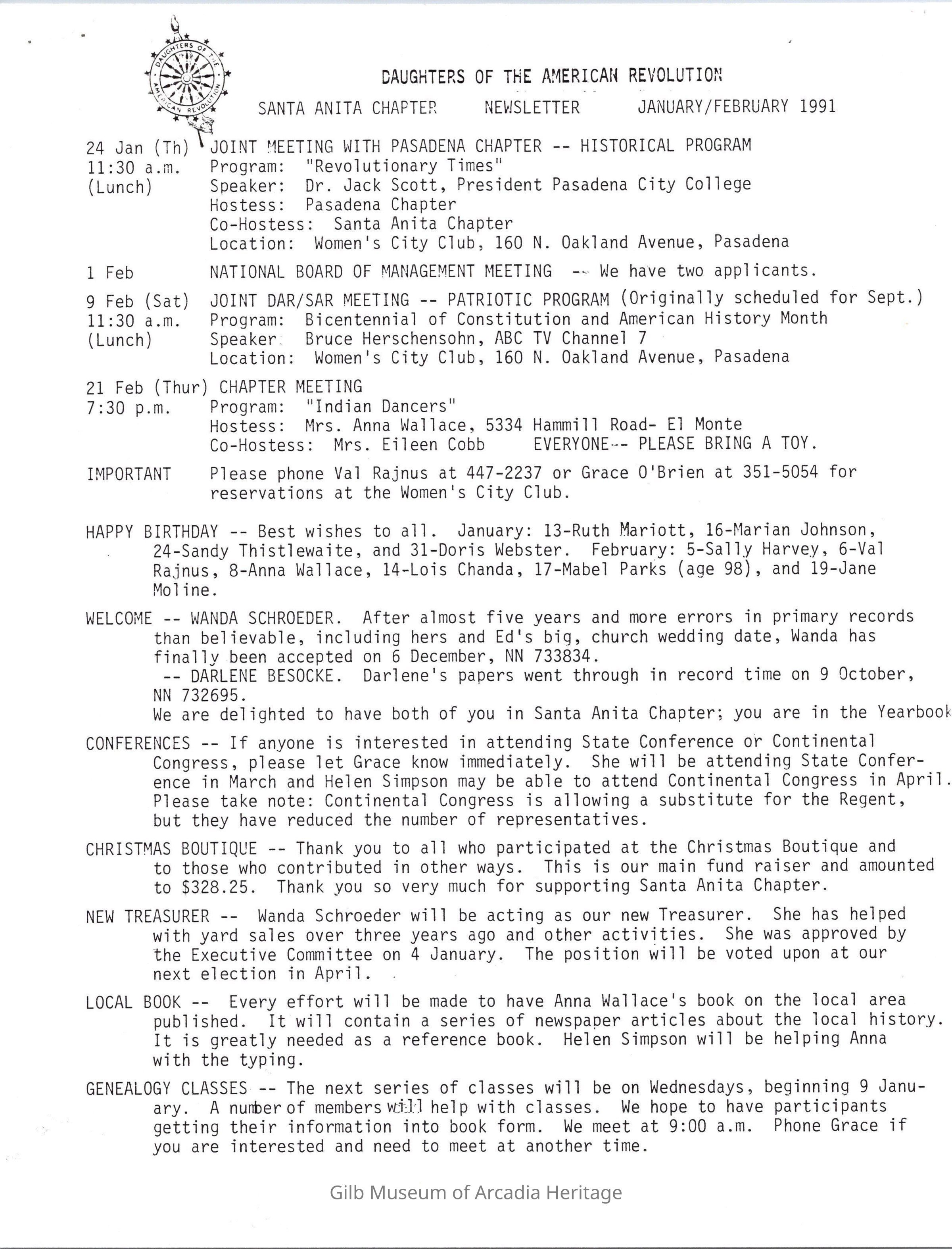 DAR: Santa Anita Chapter NSDAR January/February 1991 NewsletterCollection