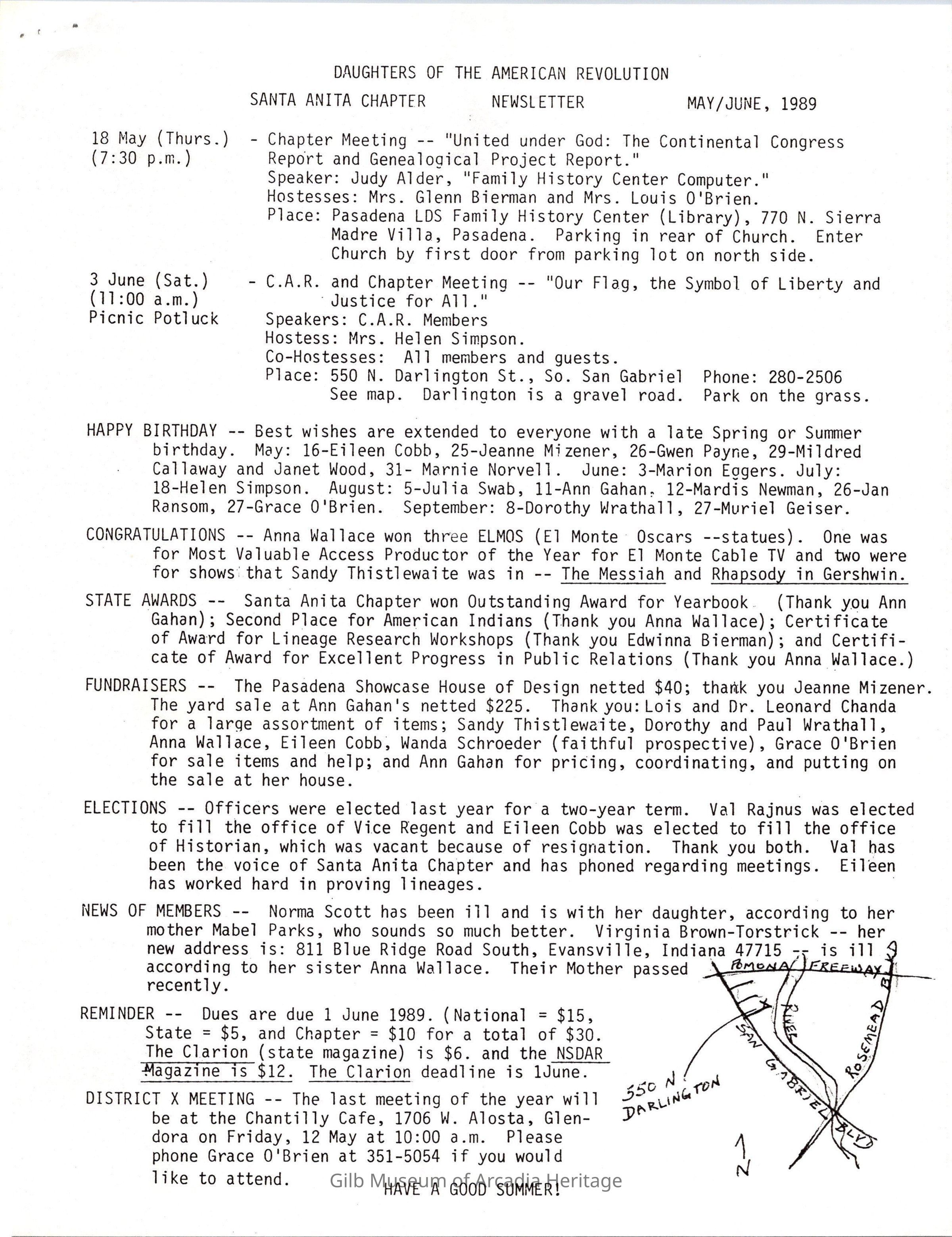 DAR: Santa Anita Chapter NSDAR May/June 1989 NewsletterEntry/Object ID
