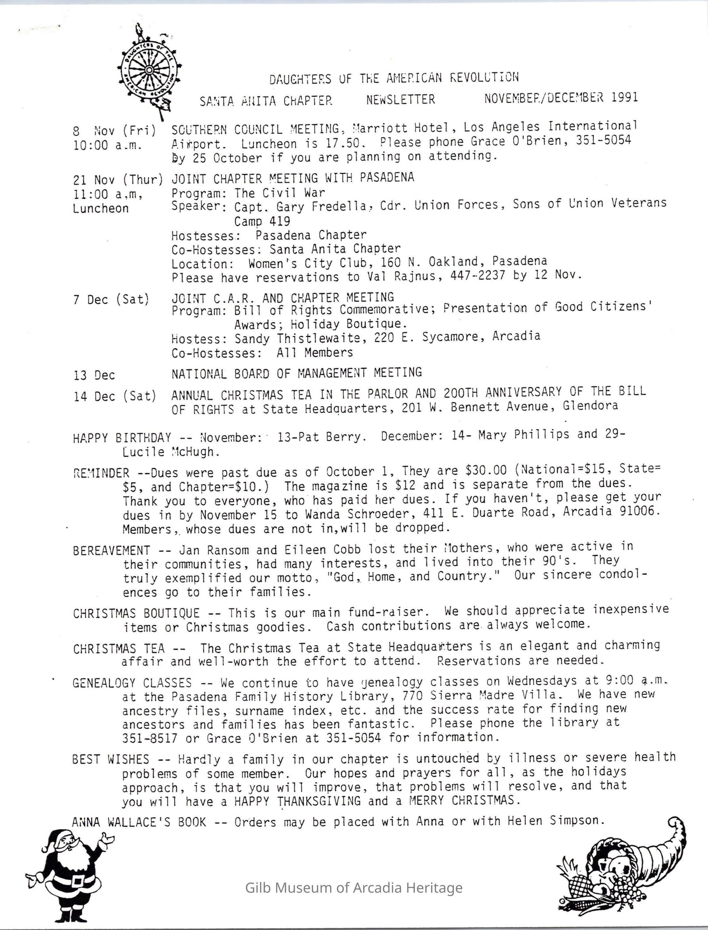 DAR: Santa Anita Chapter NSDAR November/December 1991 NewsletterCollection