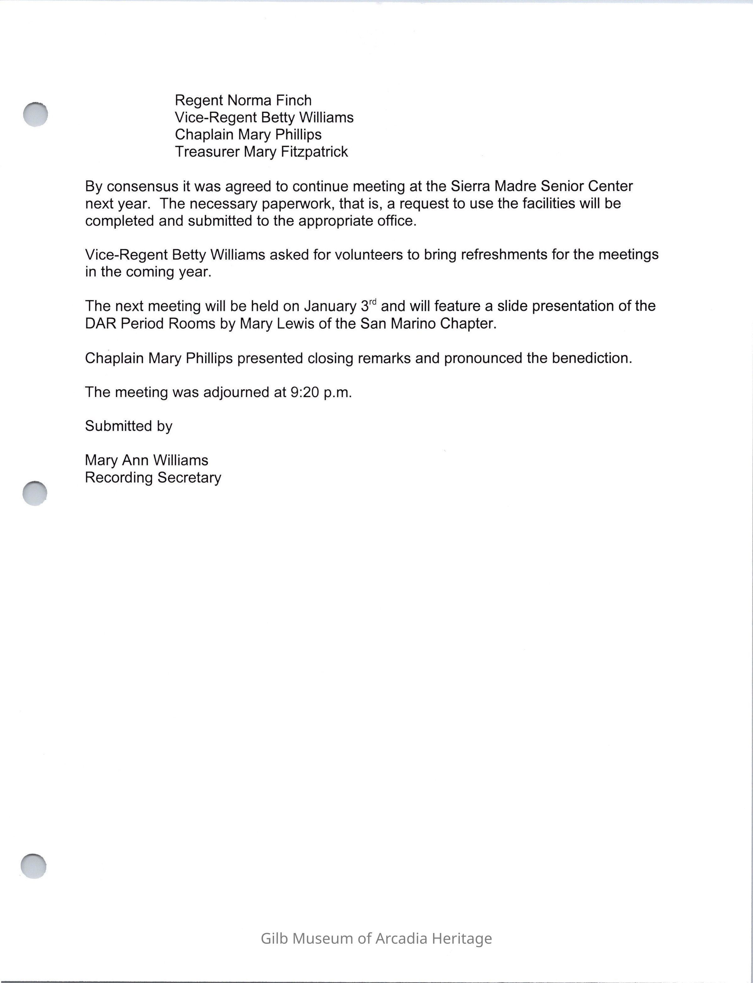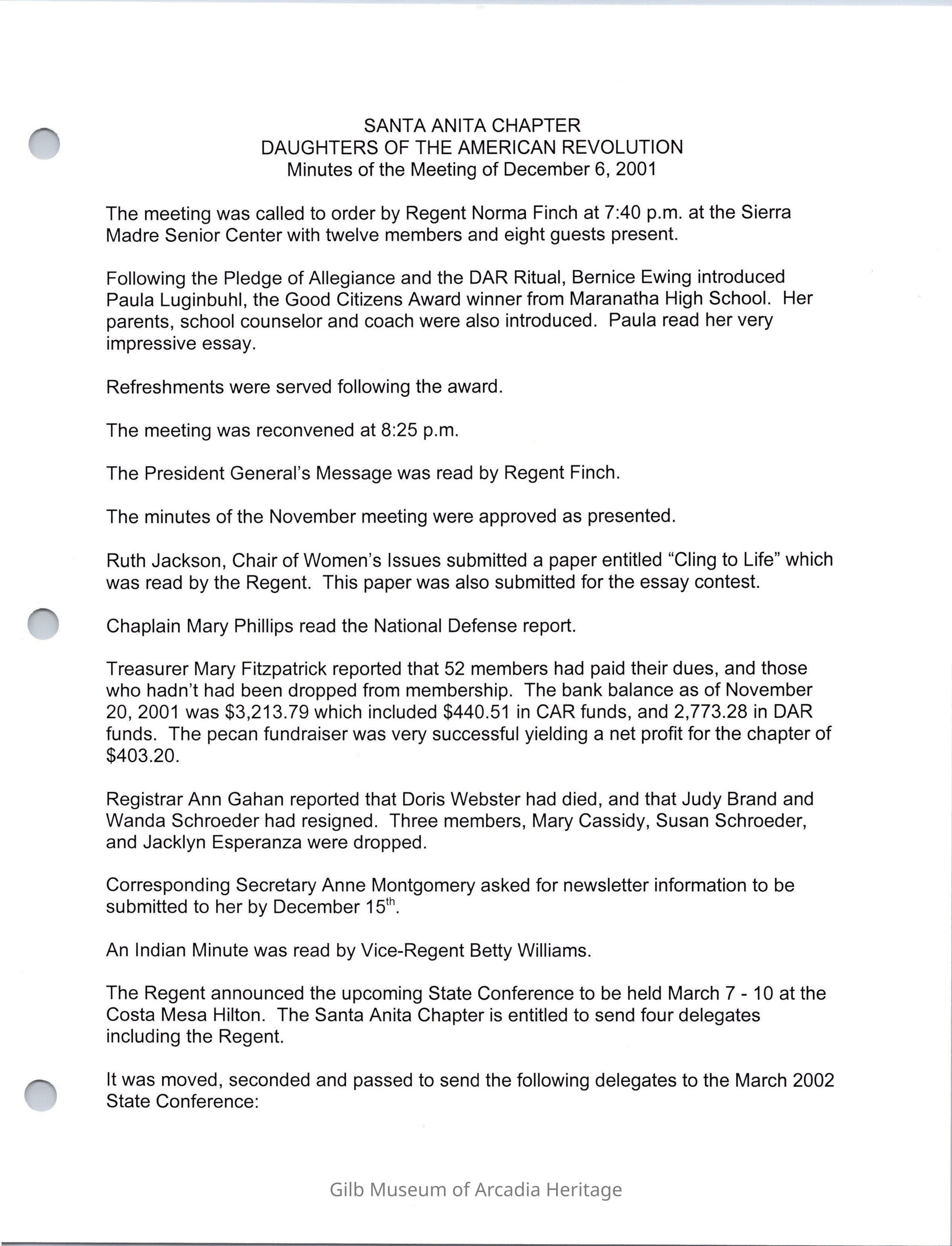 Santa Anita Chapter NSDAR Minutes Dec. 6, 2001 submitted by Norma Finch. The meeting was at the Sierra Madre Senior Center.Collection