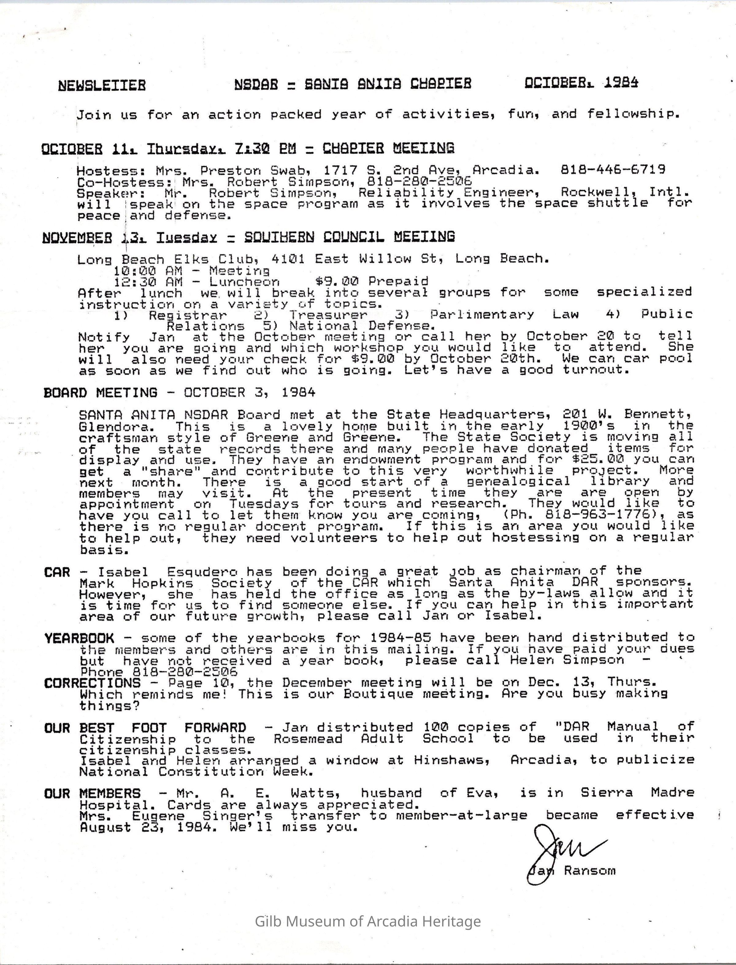 DAR: Santa Anita Chapter NSDAR October 1984 Newsletter