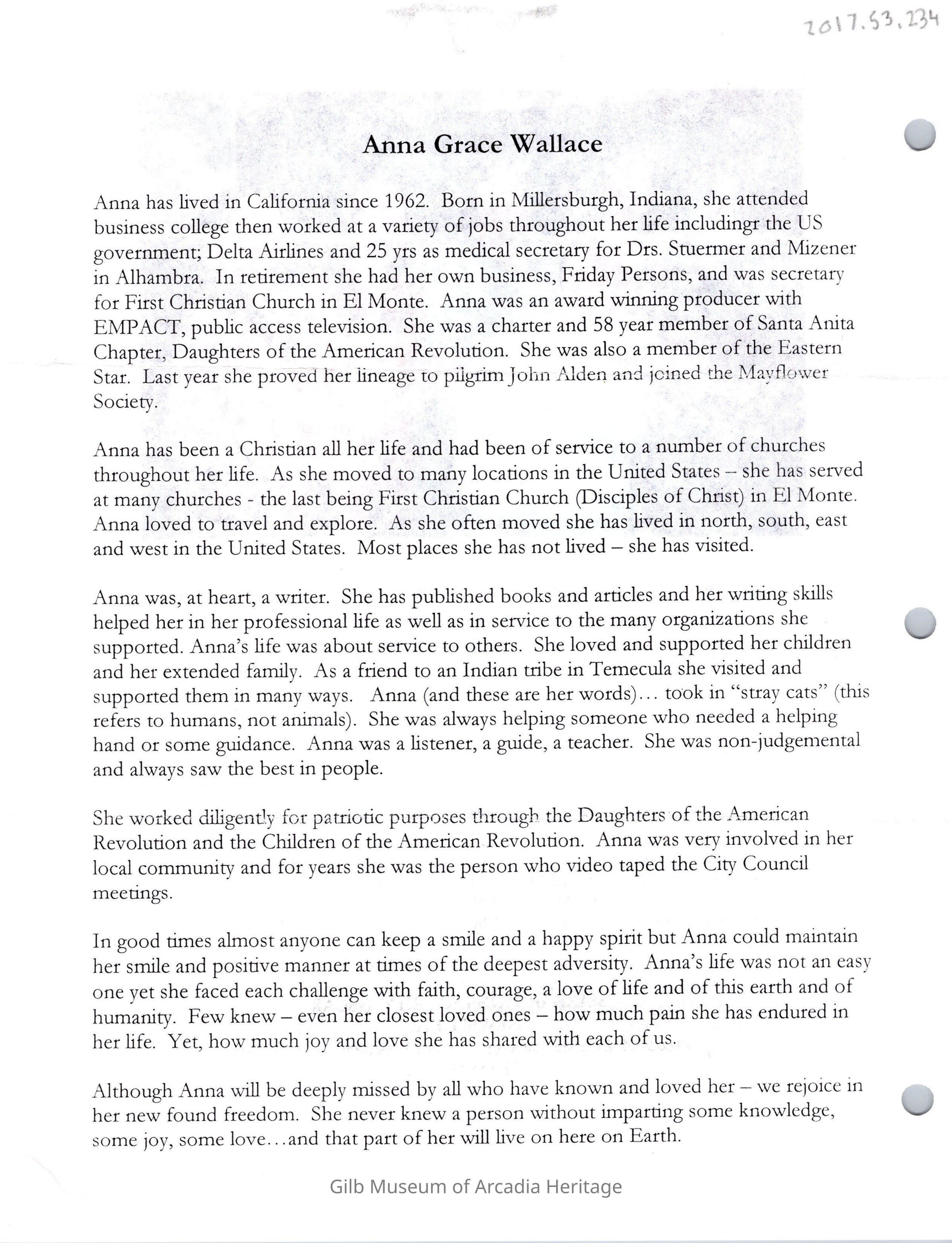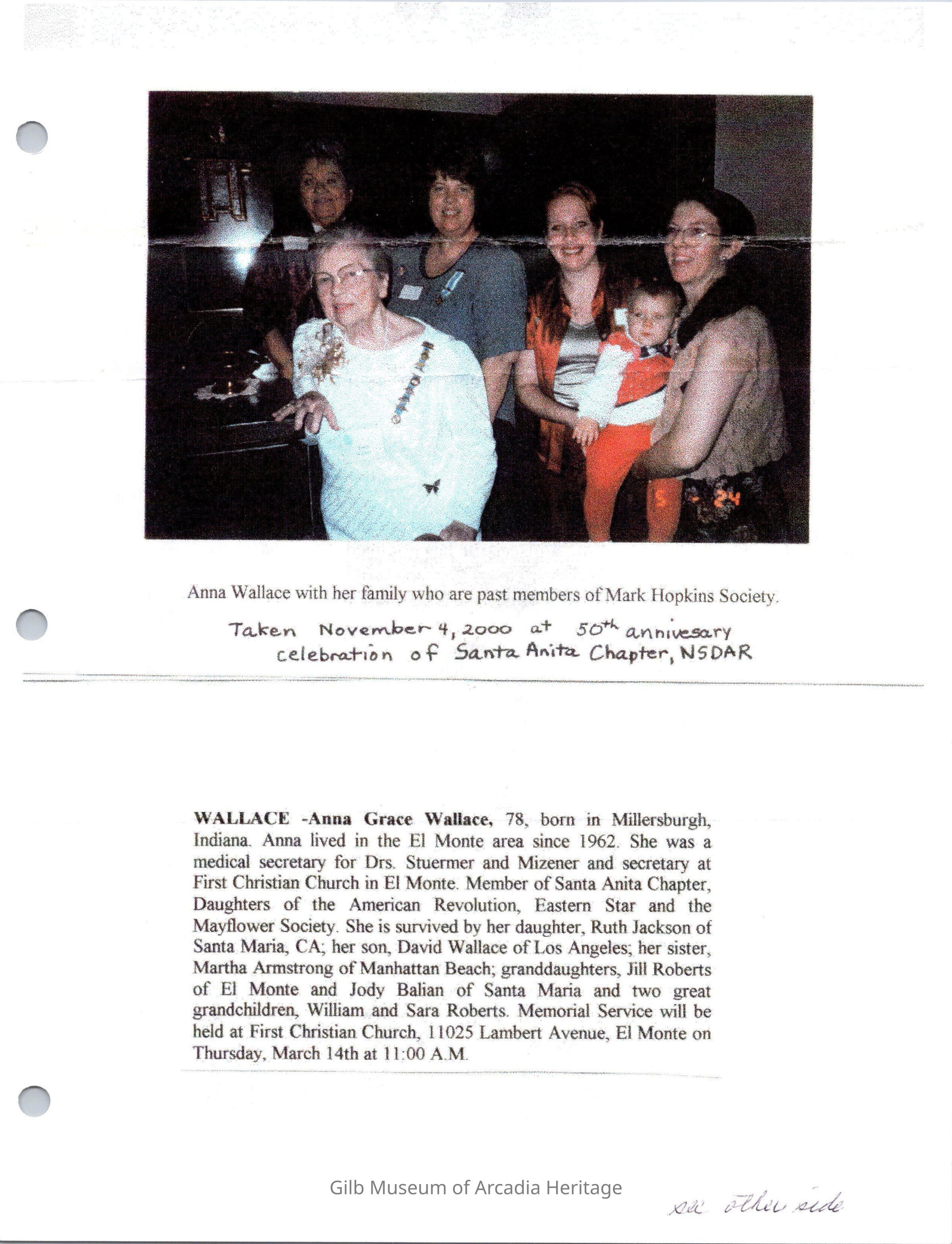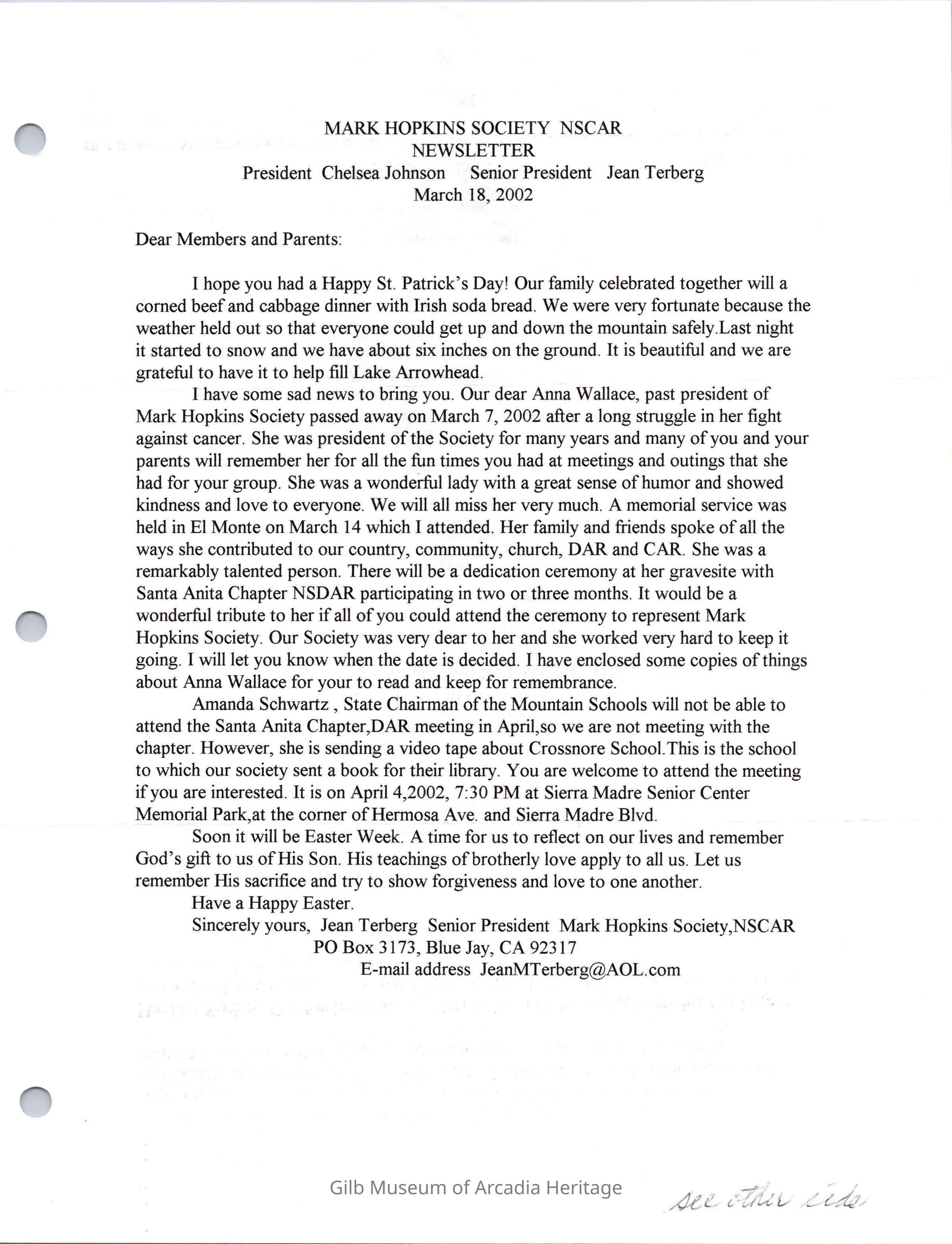Mark Hopkins Society NSCAR Newsletter, Mar. 18, 2002. There is a pamphlet about Anna Wallace.