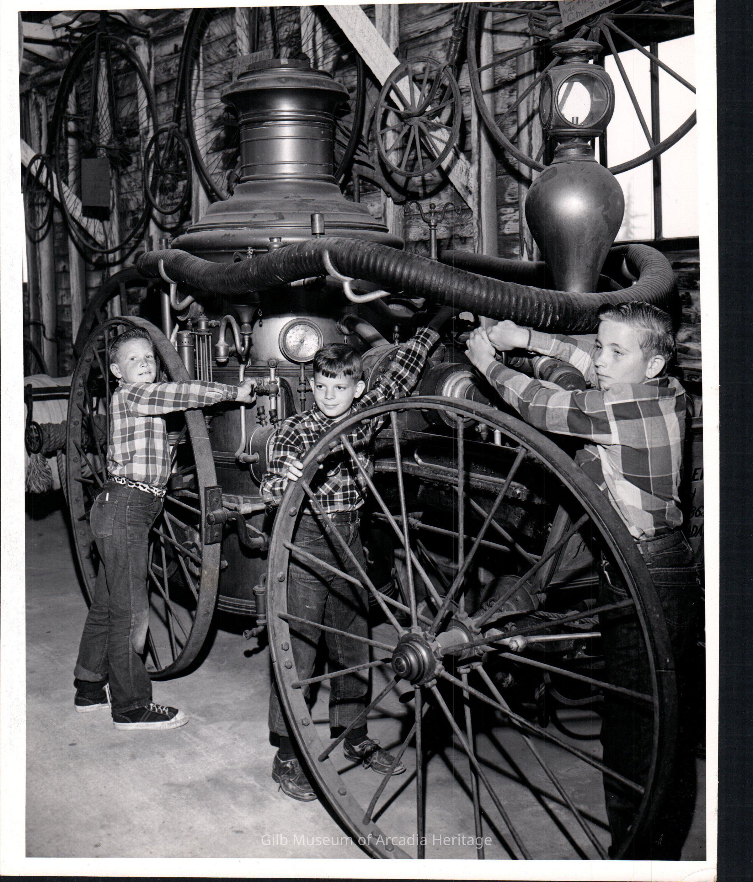 Three boys playing with the steam engine display at the Pony Express Museum in Arcadia, CA.