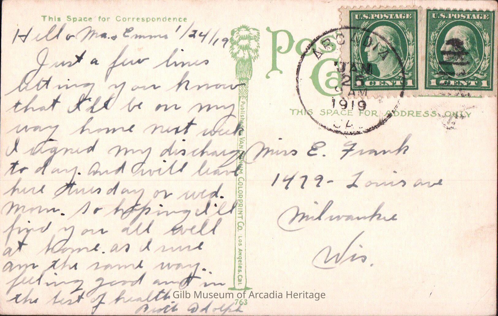 Just a few lines letting you know that I’ll be on my way home next week. I signed my discharge today. And will leave here Tuesday or wed. Mom, so hoping I’ll find you all well at home. As I usual am the same way… feeling good and in the best of health.