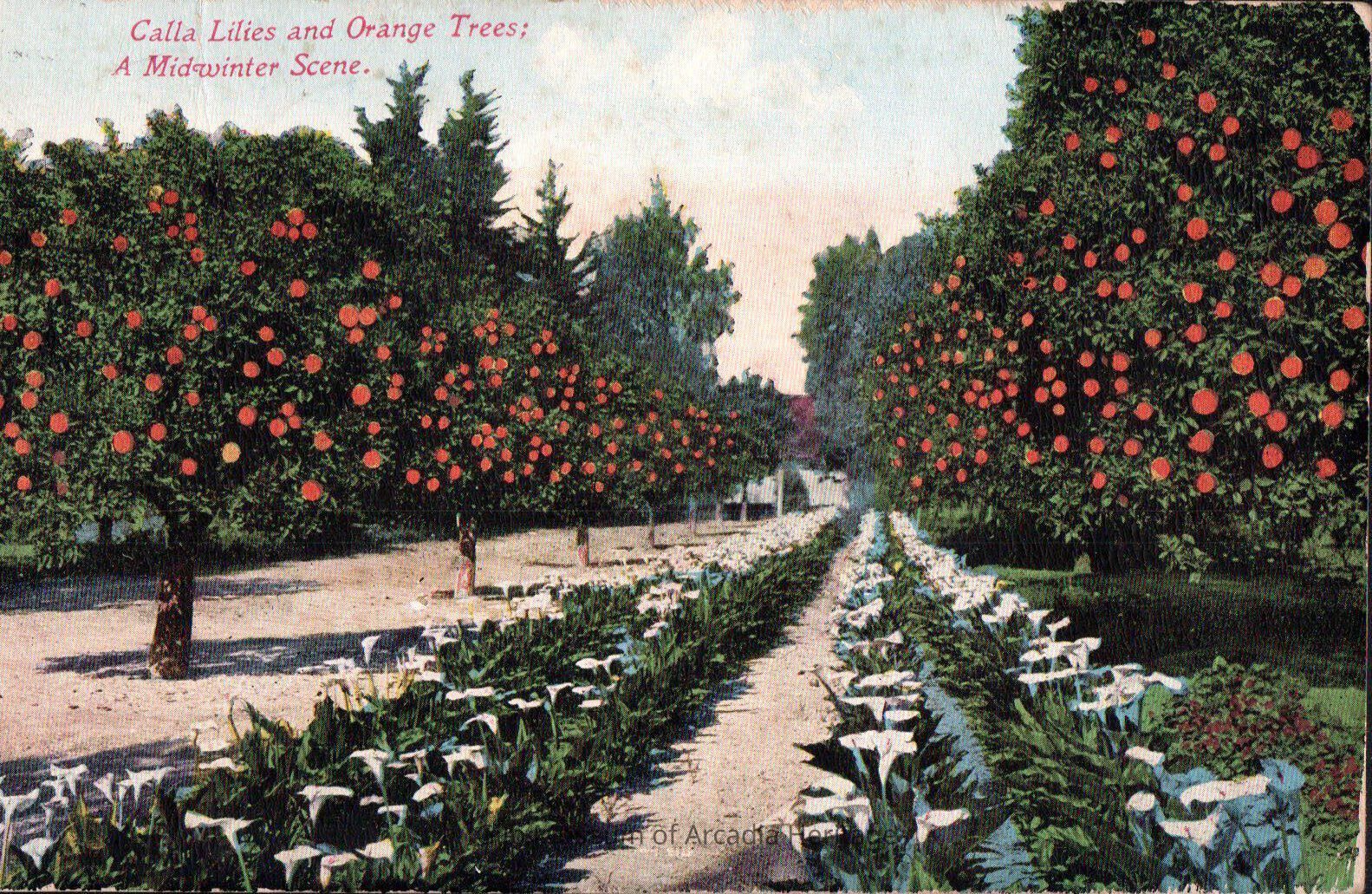 Front of postcard: Rows of Calla Lilies below orange trees.