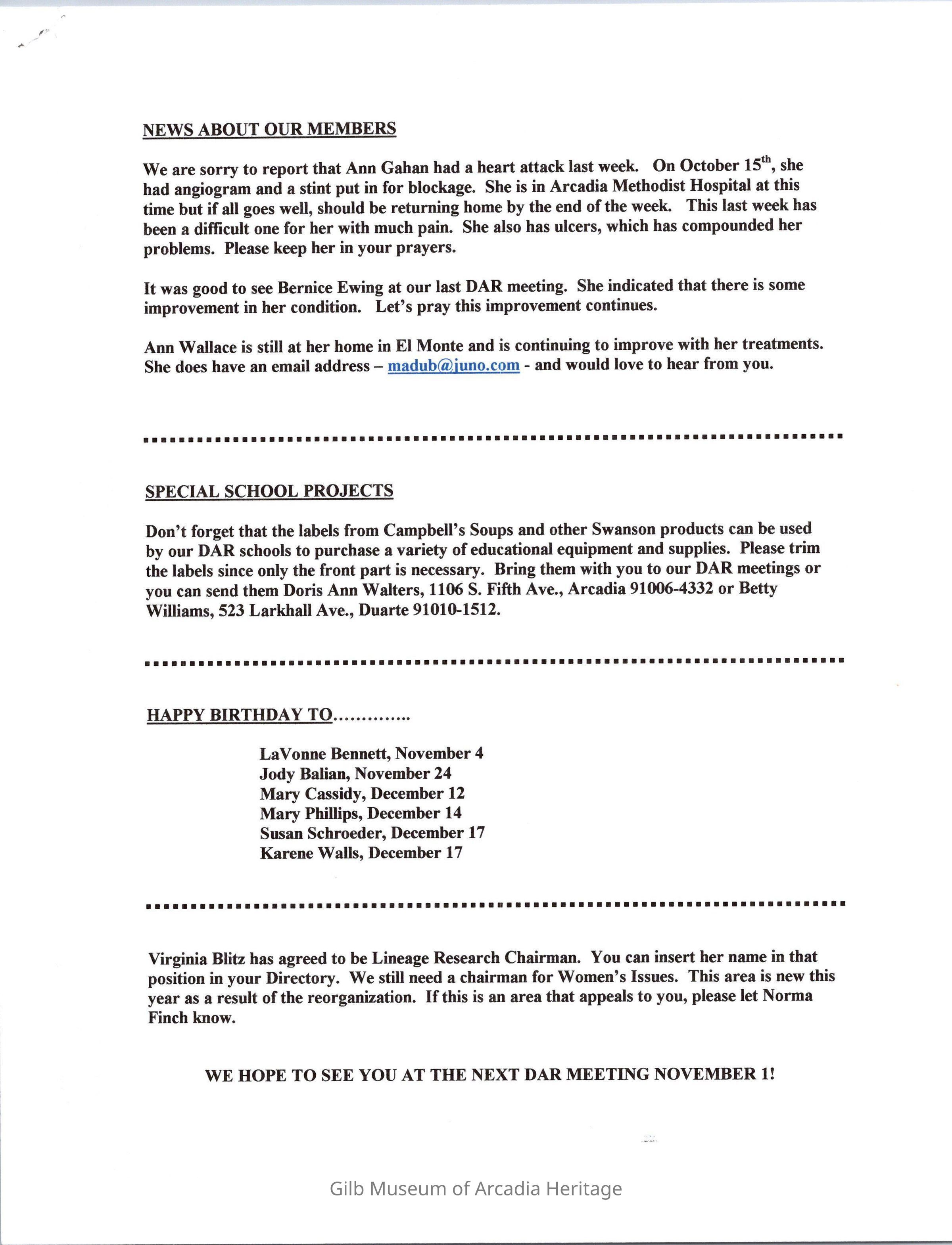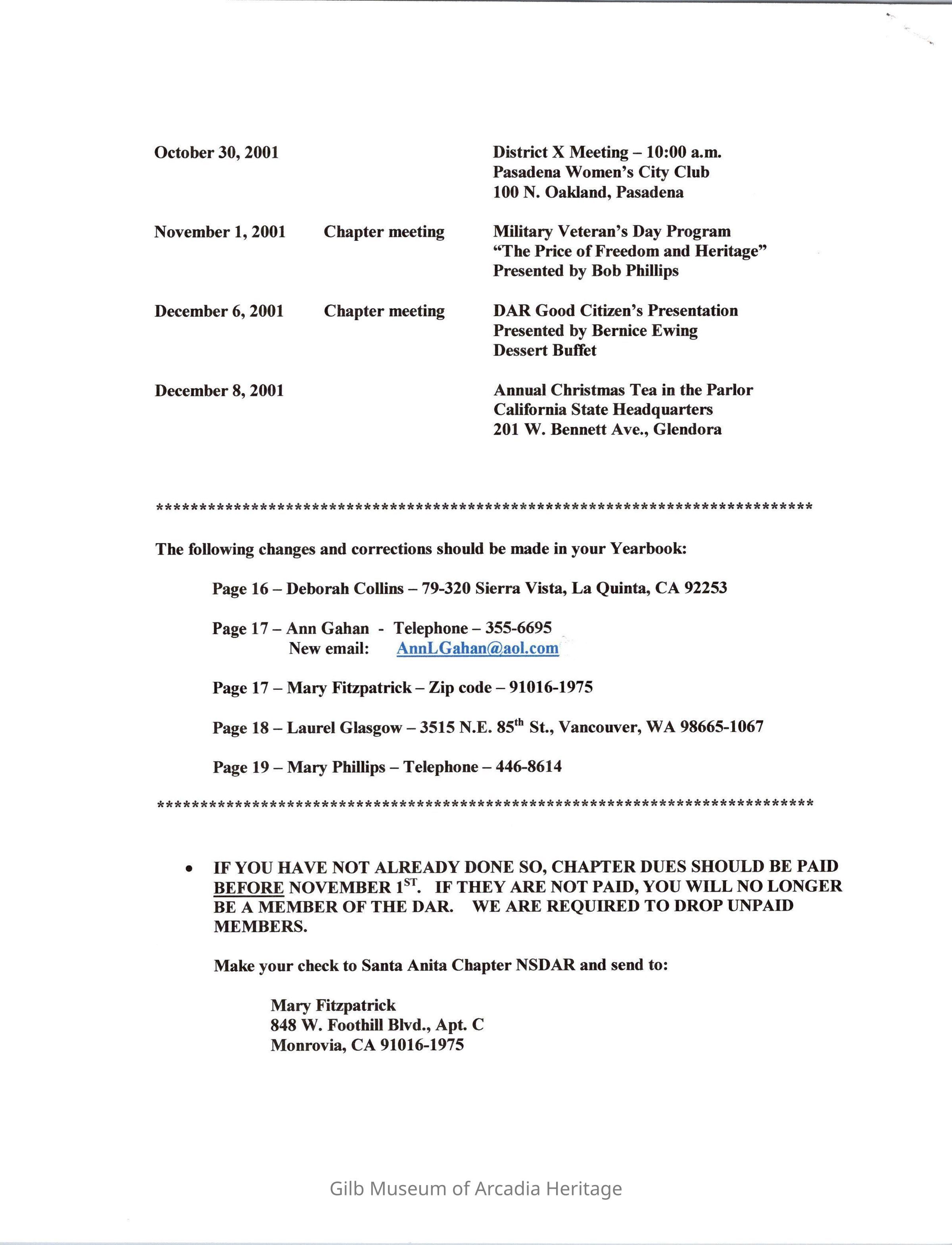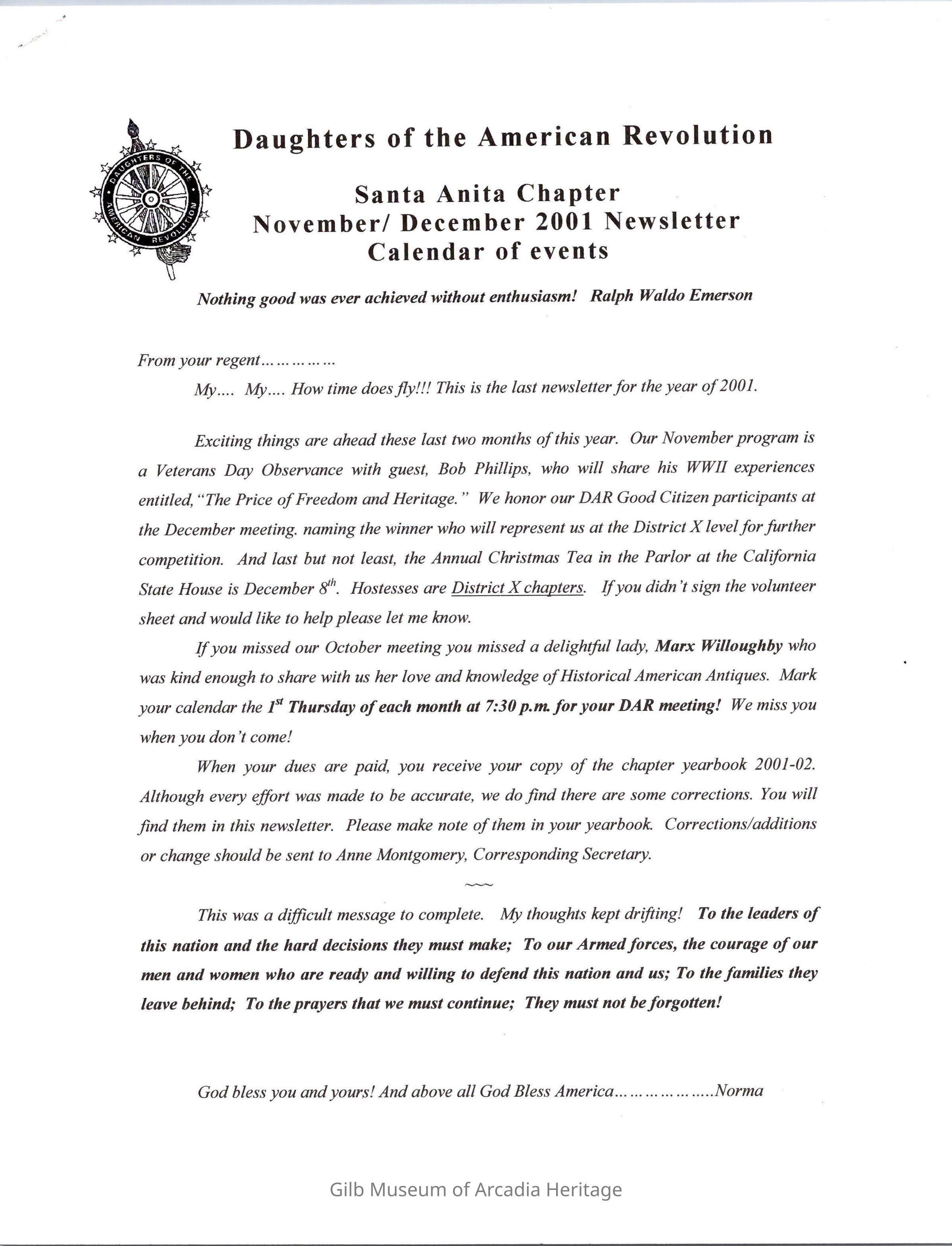 DAR: Santa Anita Chapter NSDAR November/December 2001 Newsletter