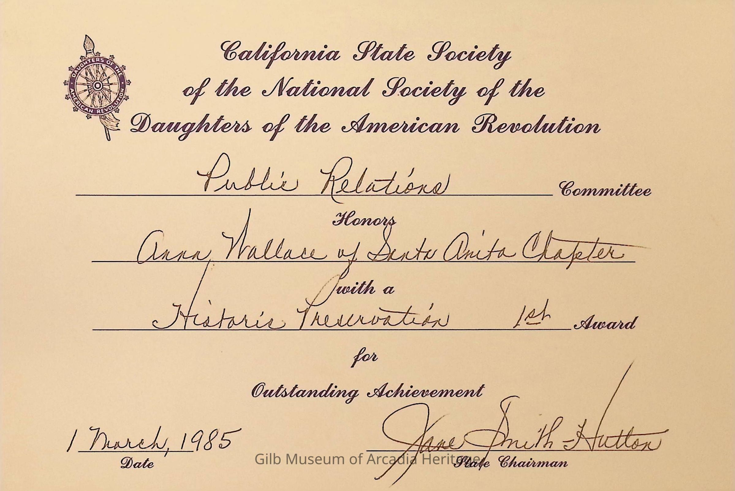 CSS DAR Award for Historic Preservation, March 1985 It was a first place award.Collection