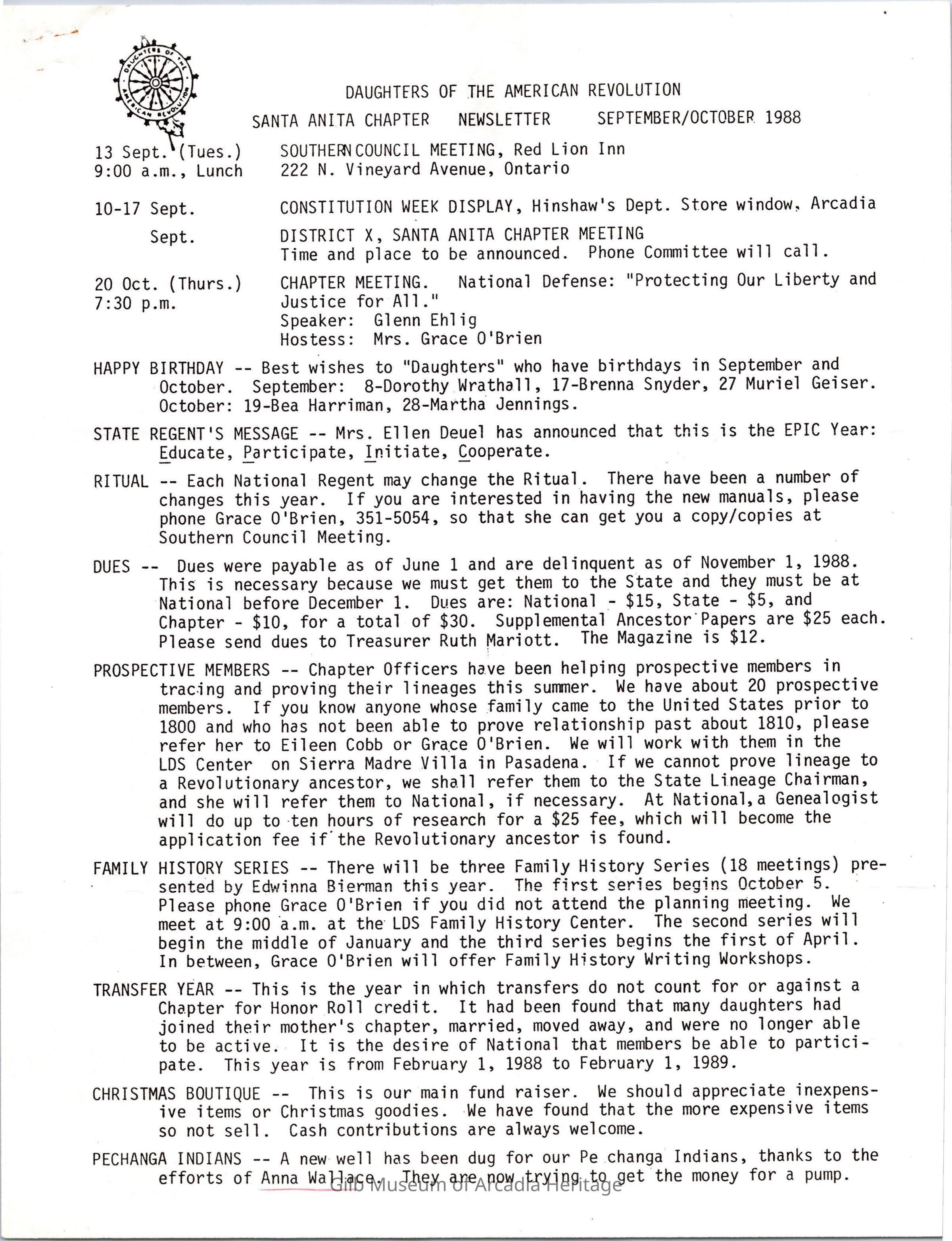 DAR: Santa Anita Chapter NSDAR September/October 1988 NewsletterCollection