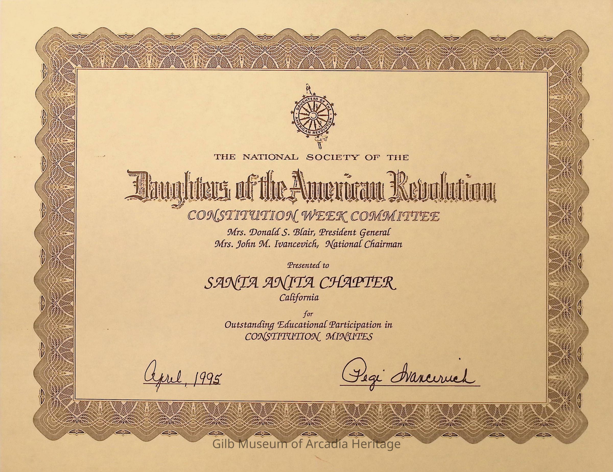DAR Award For Outstanding Educational Participation in Constitution Minutes in April 1995. Presented by the Constitution Week Committee Mrs. Donald S. Blair, President General and Mrs. John M. Ivancevich, National Chairman.Collection