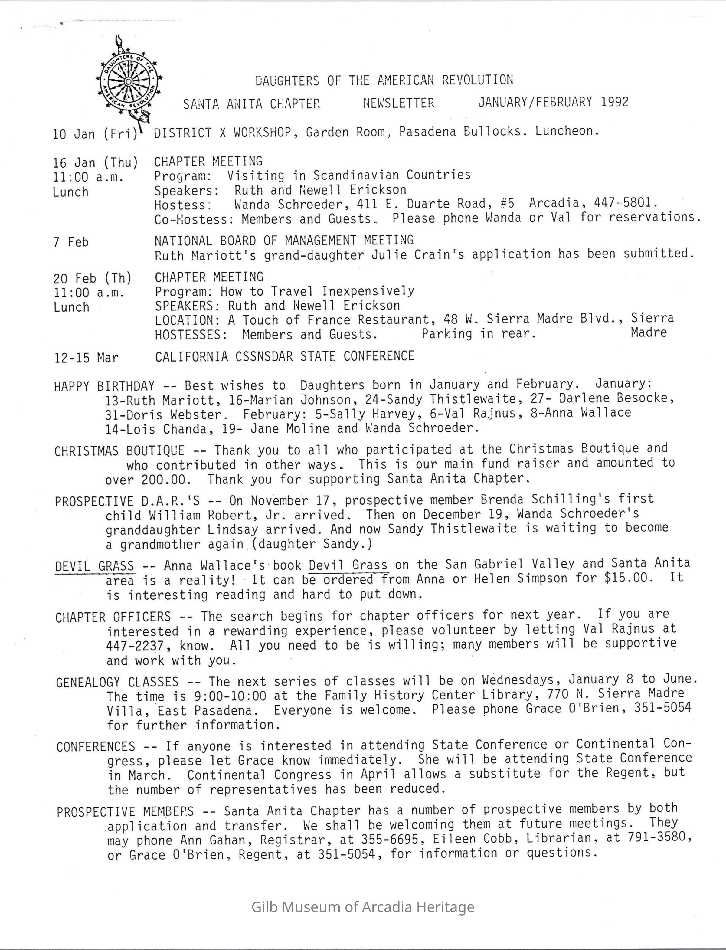 DAR: Santa Anita Chapter NSDAR January/February 1992 Newsletter