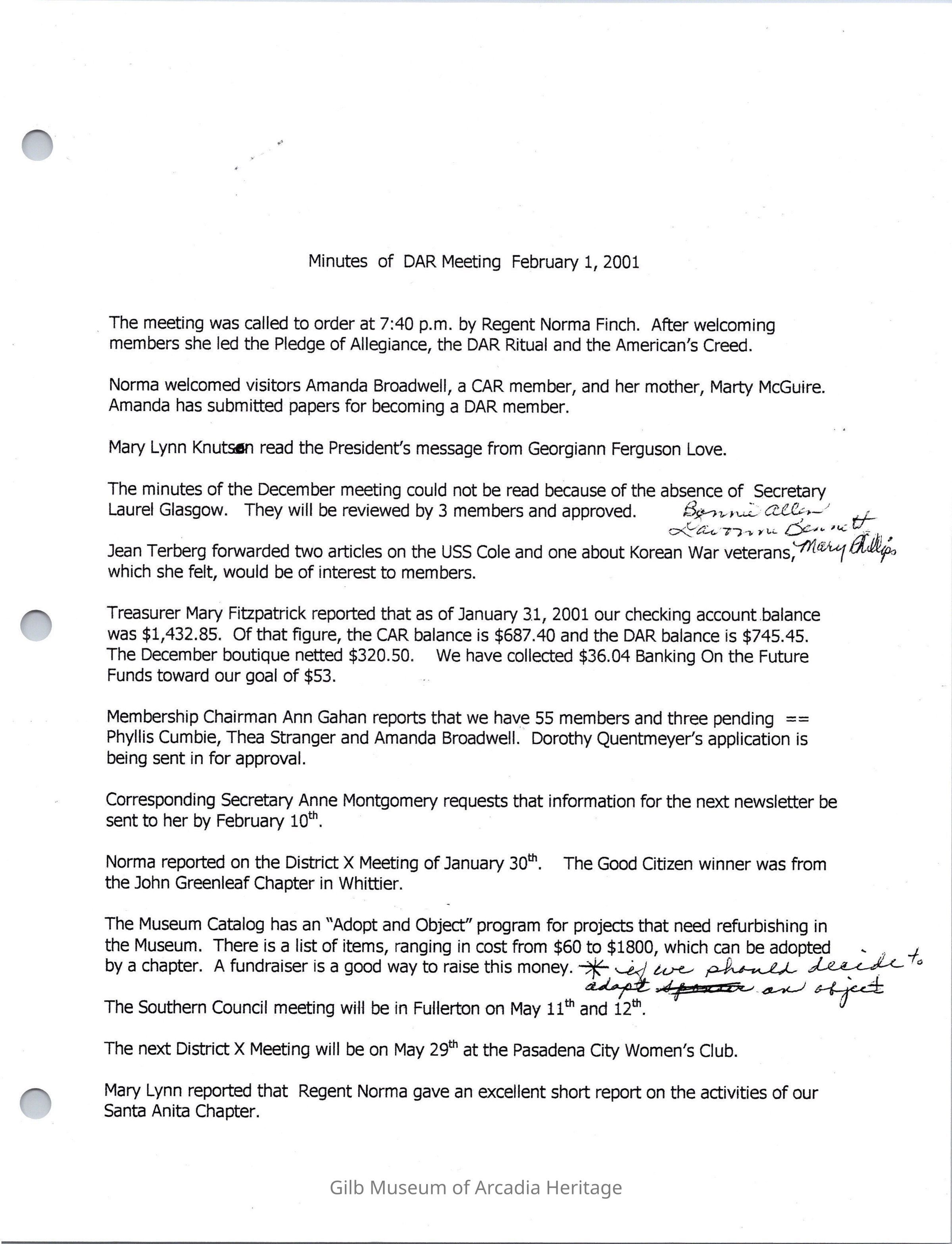 Santa Anita Chapter, DAR Board Meeting Feb.1, 2001Entry/Object ID