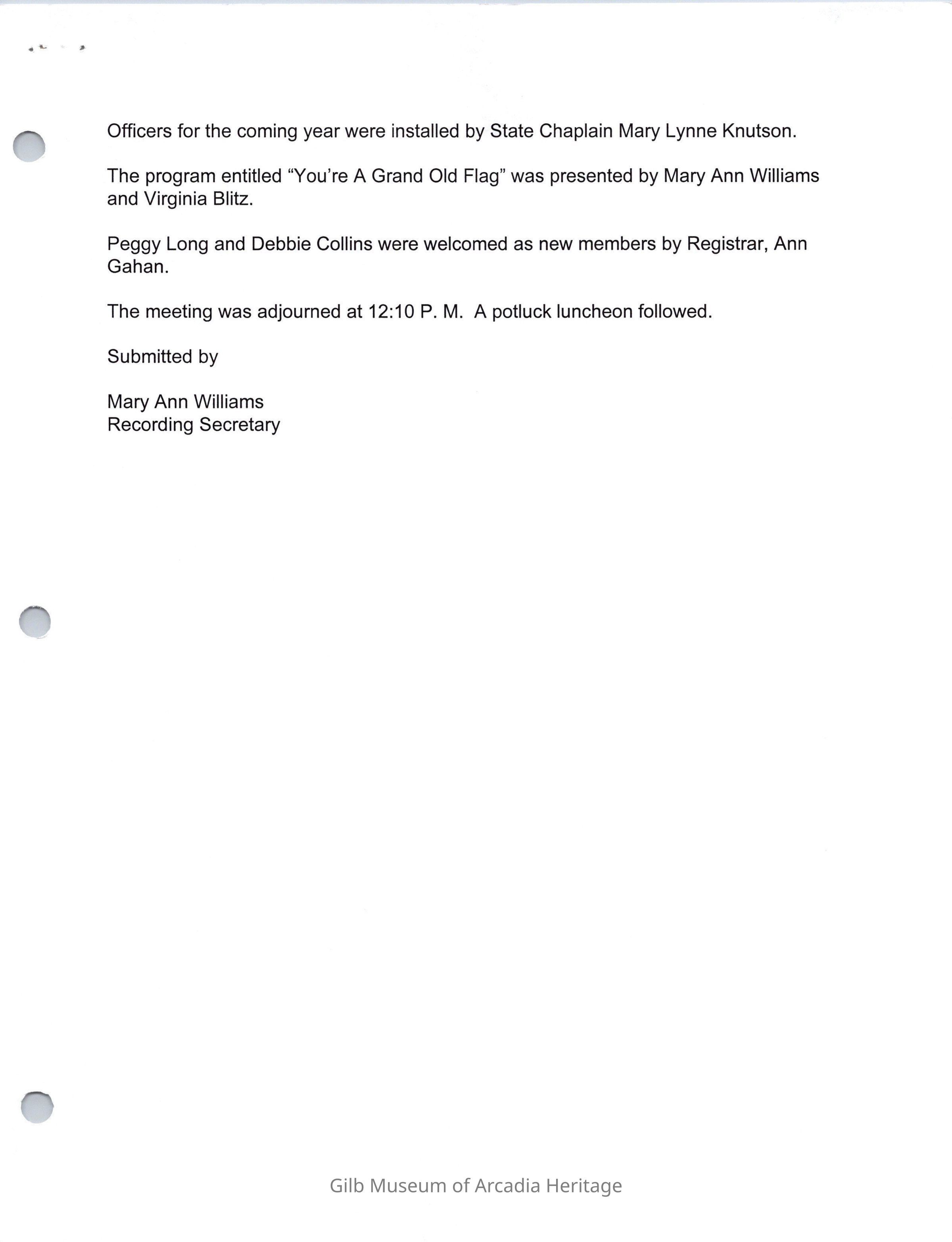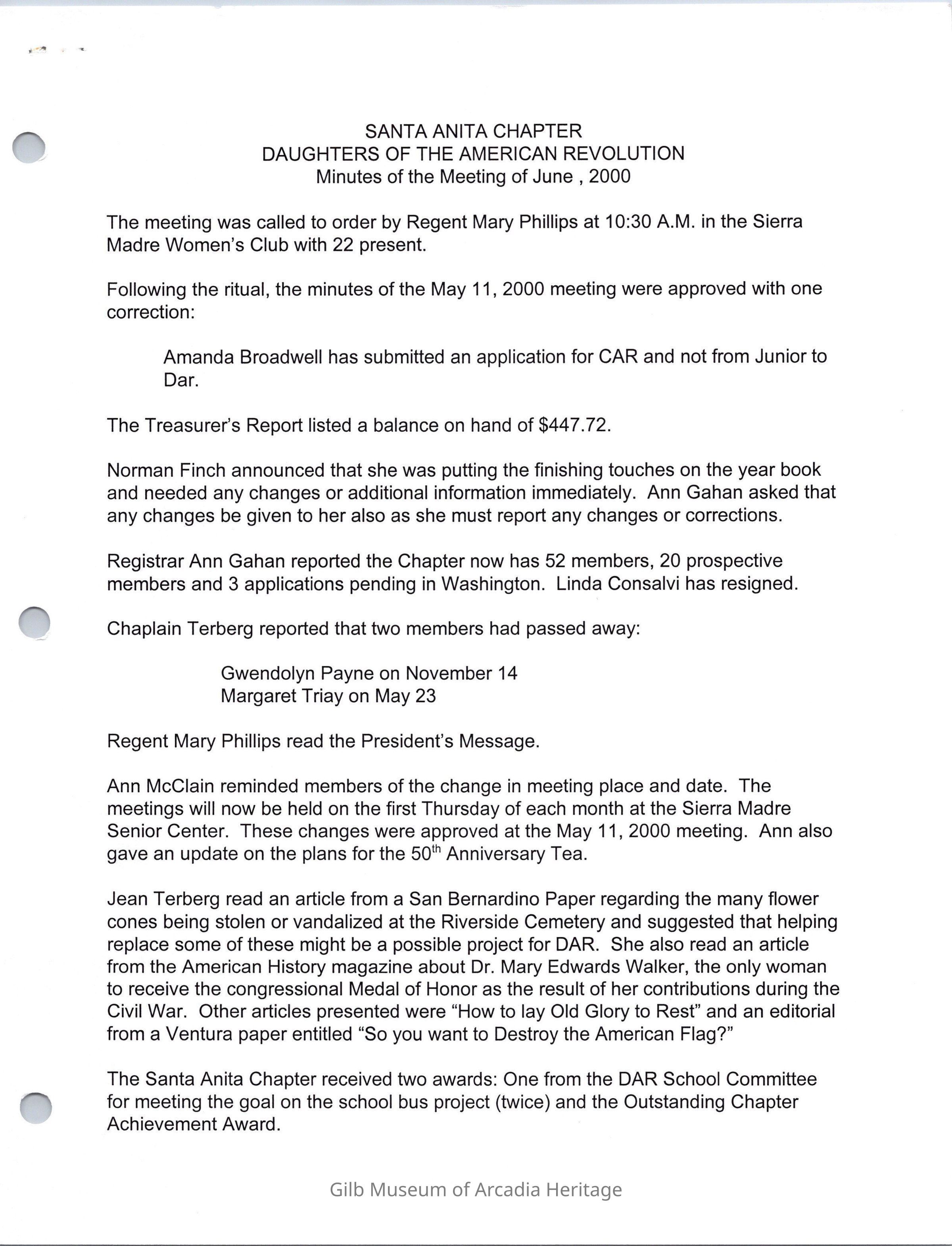 Santa Anita Chapter, DAR meeting minutes, June 2000Collection