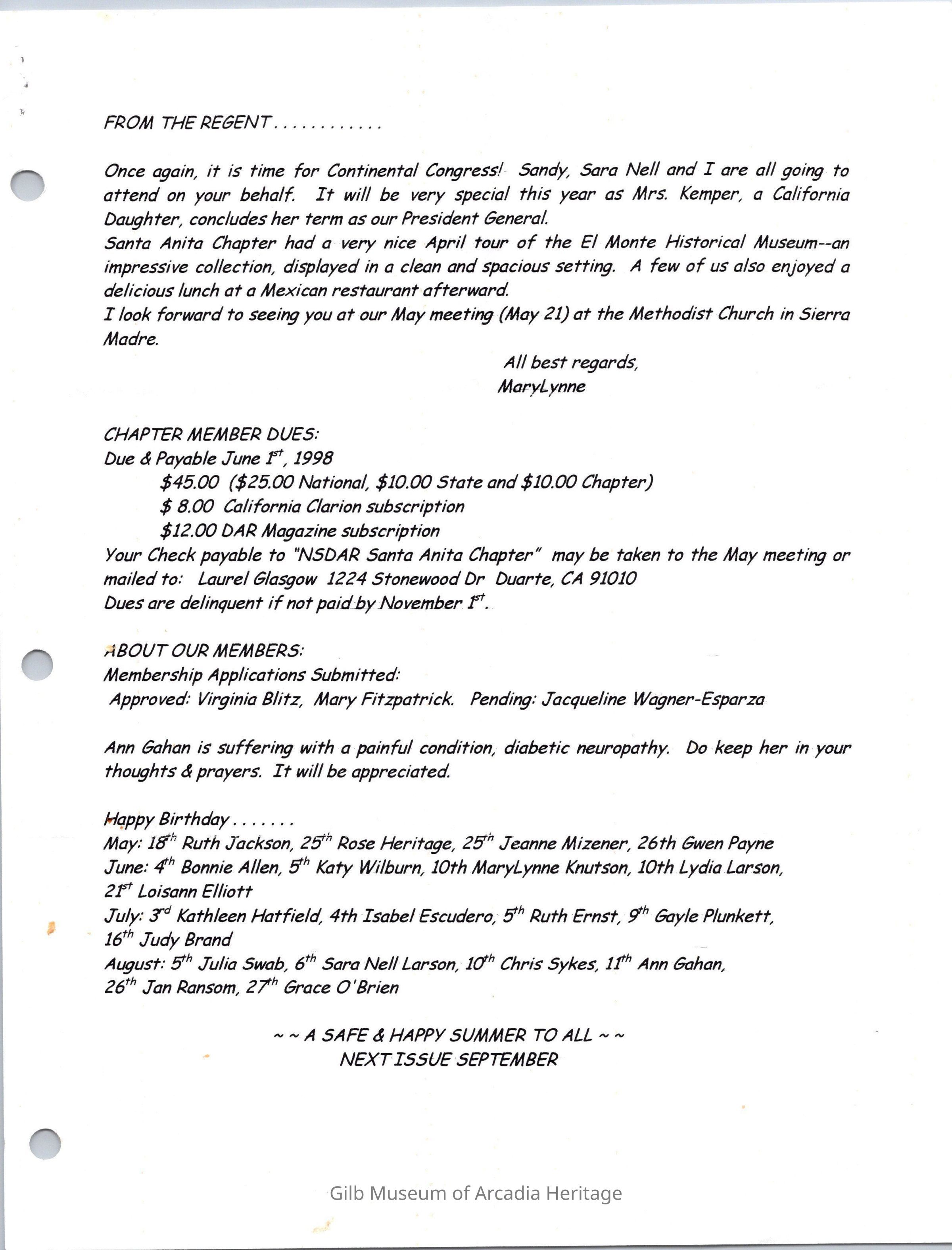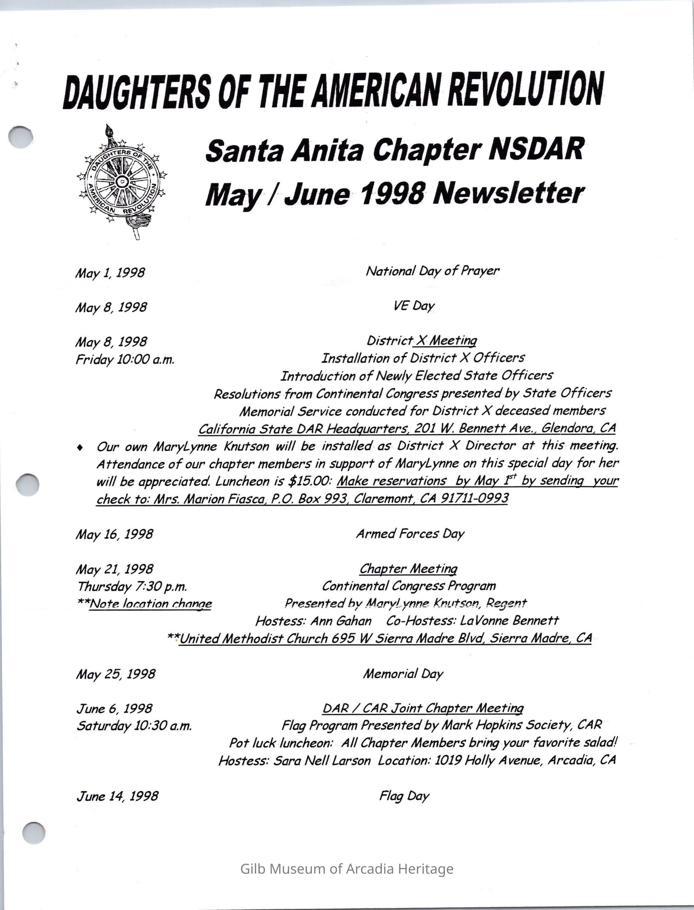 DAR: Santa Anita Chapter NSDAR May/June 1998 NewsletterCollection