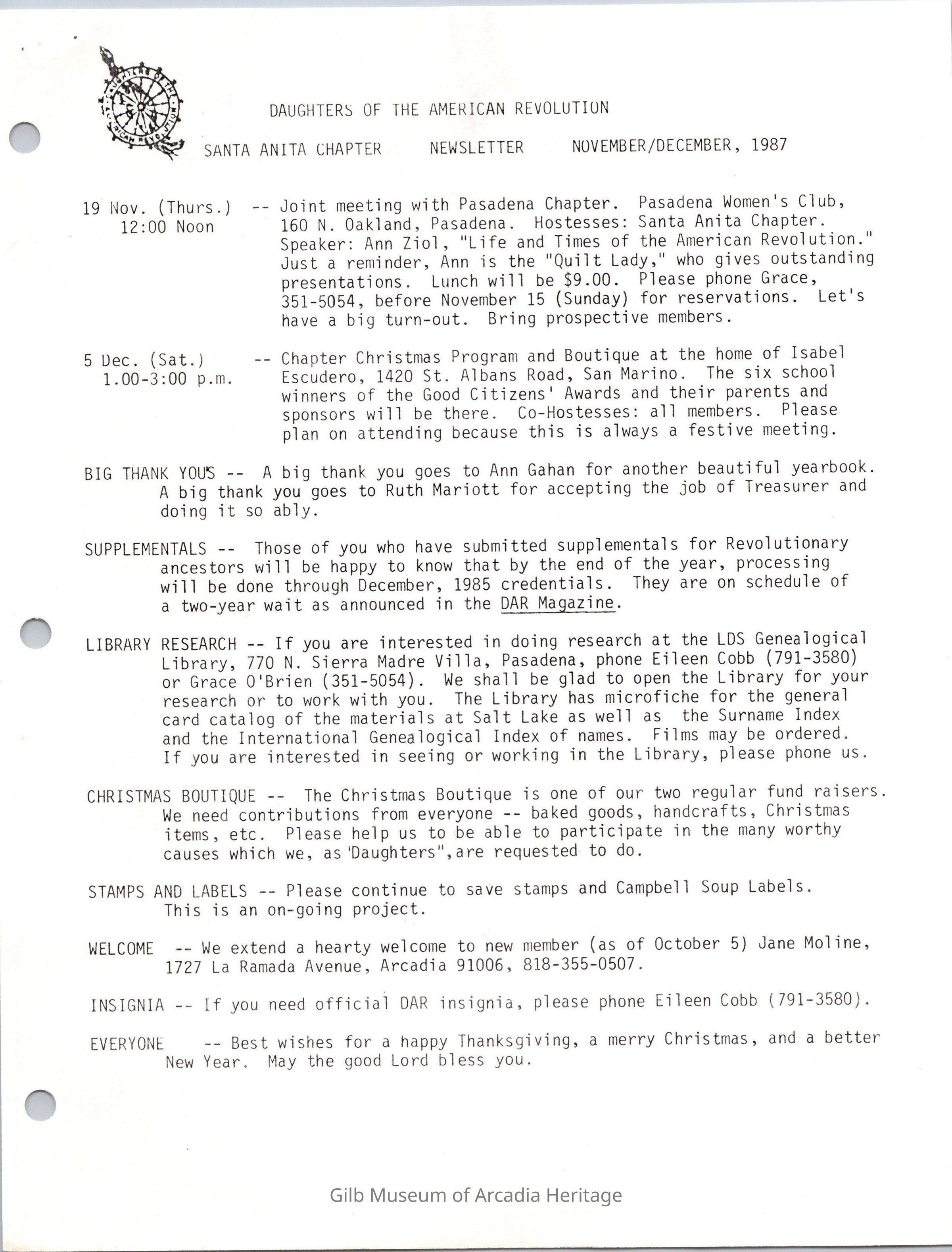 DAR: Santa Anita Chapter NSDAR November/December 1987 NewsletterCollection
