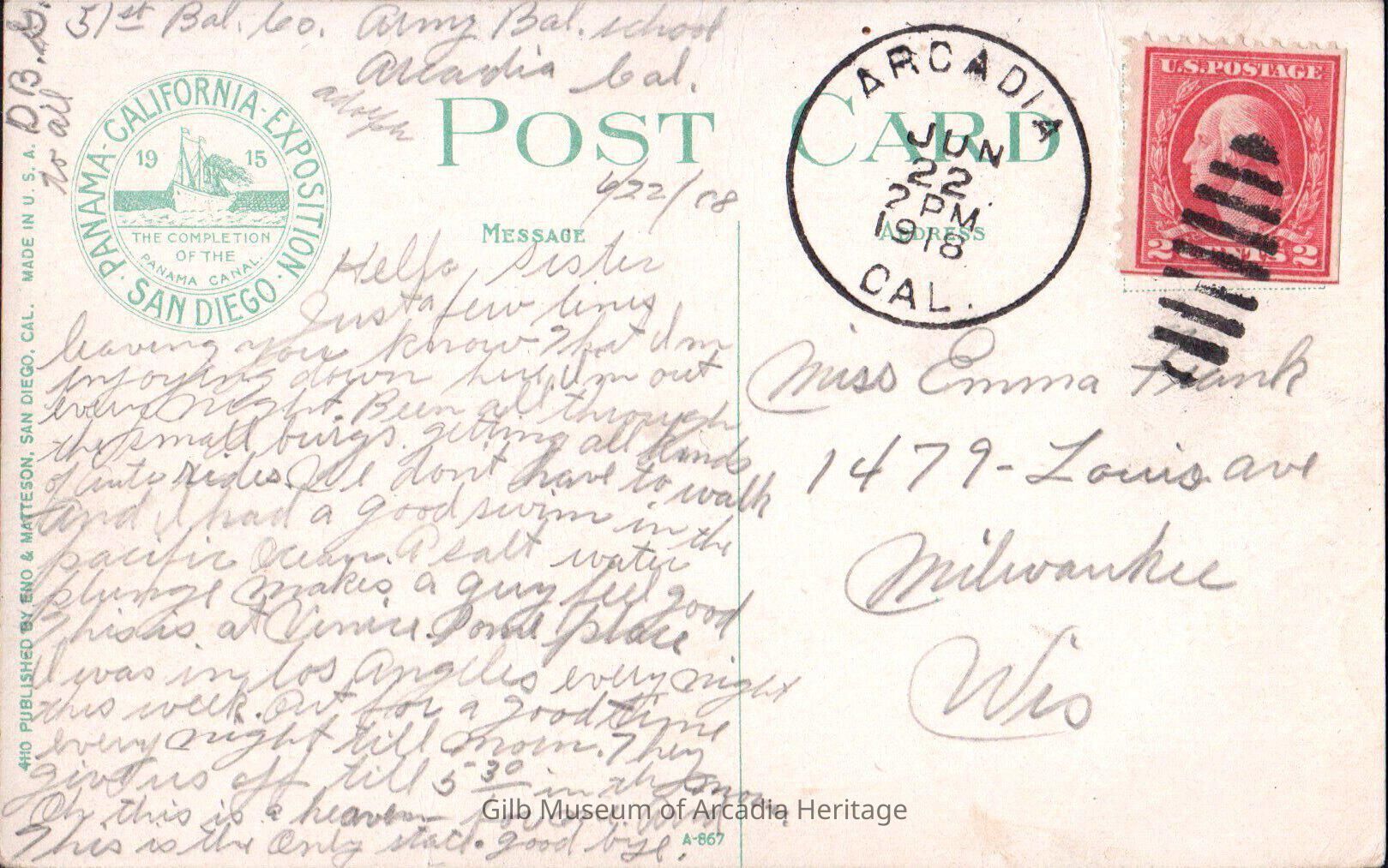 51st Bal[loon] Army Bal[loon] school, Arcadia Cal., Adolph, Hello sister, Just a few lines leaving you know that I'm enjoying down here. I'm out every night. Been all through the small burgs getting all kinds of auto rides. We don't have to walk and I had a good swim in the Pacific Ocean. A salt water plunge males a guy feel good. this is at Venice some place. I was in Los Angeles every night this week Out for a good time every night till morn. They give us off till 5:30 in the morn. Oh this is a heaven for me and this is the only state. Good Bye. D.B.G. to all