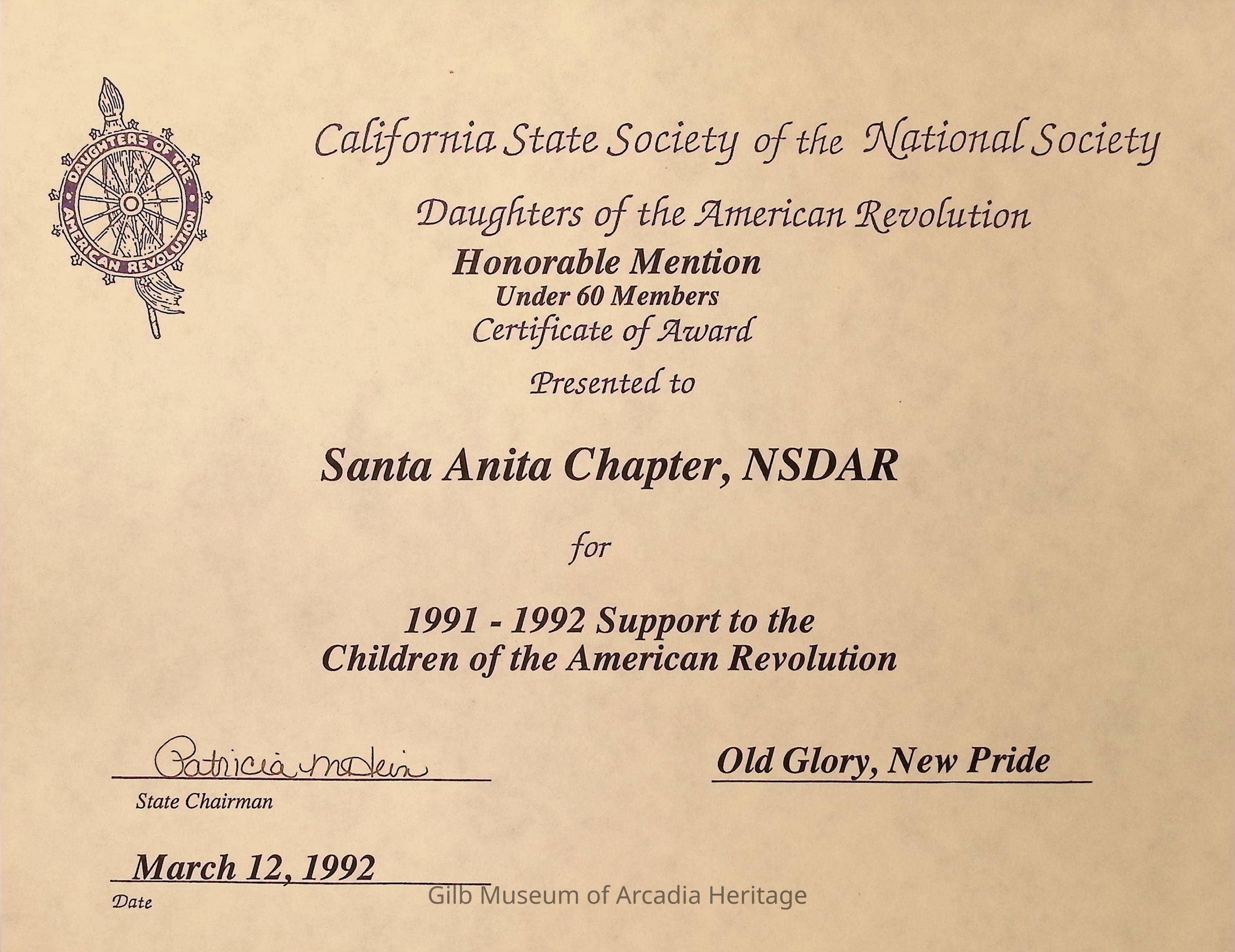 CSS DAR Award for 1991-1992 Support to the Children of the American Revolution.It was a honorable mention award.