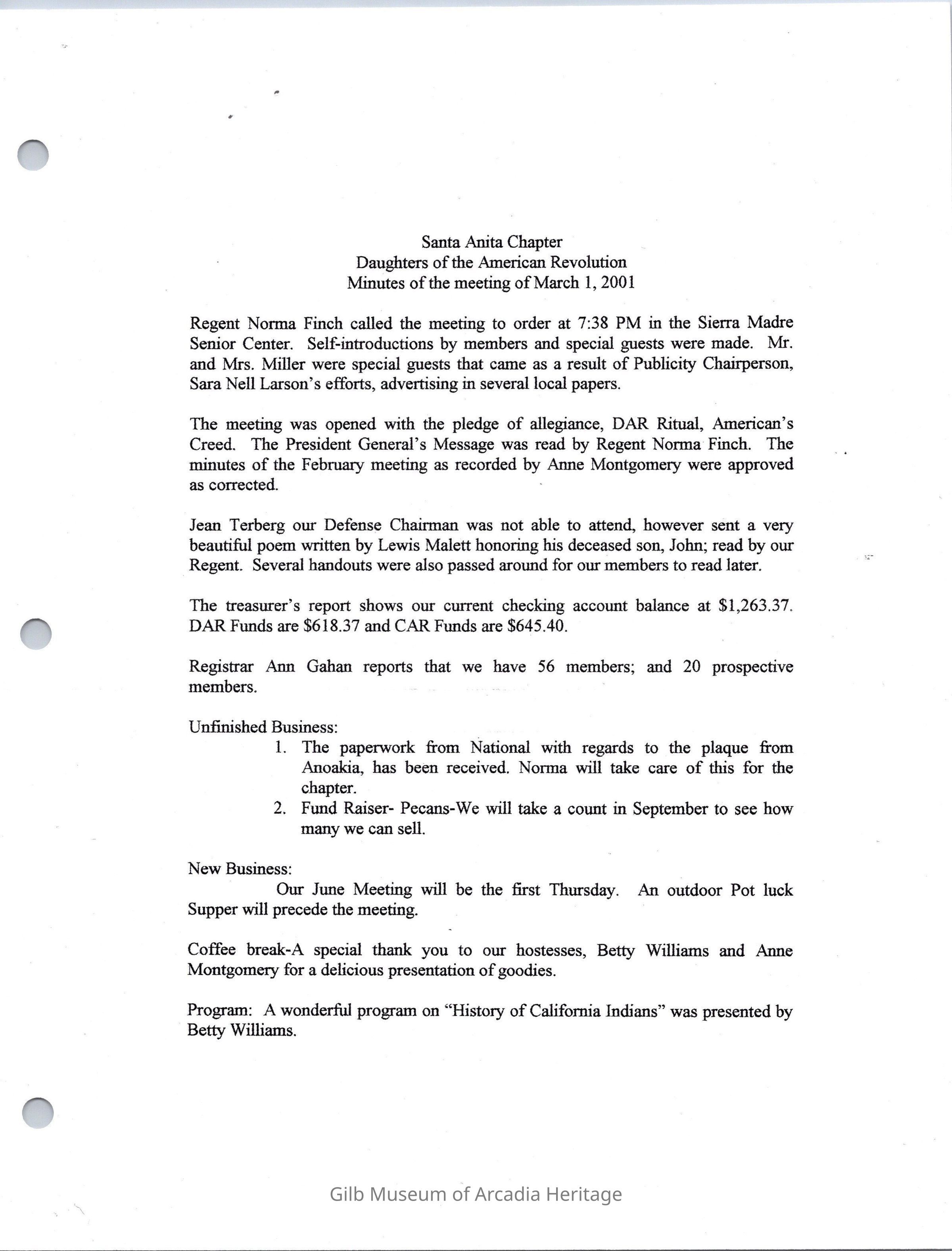 Santa Anita Chapter, DAR Board Meeting Mar. 1, 2001
