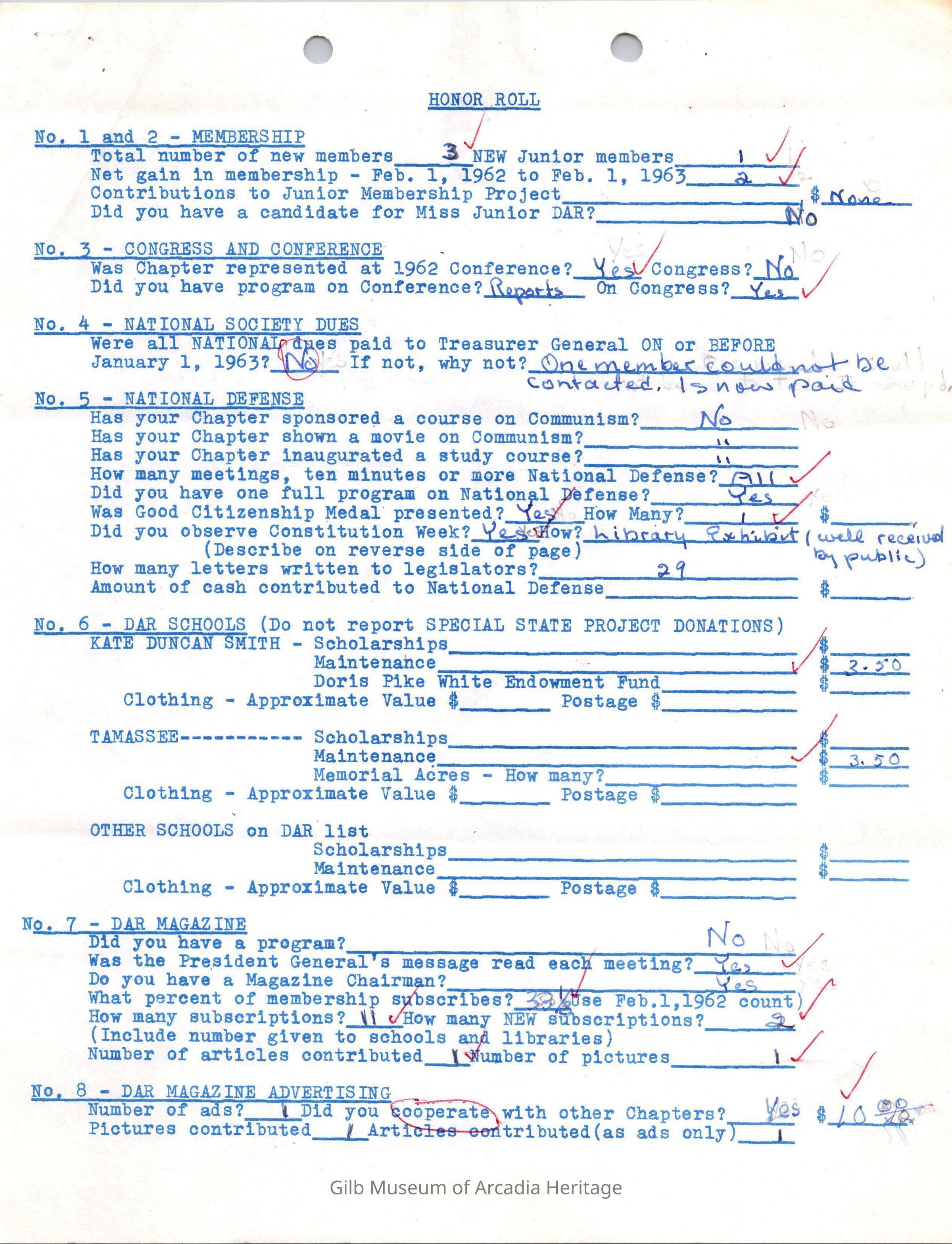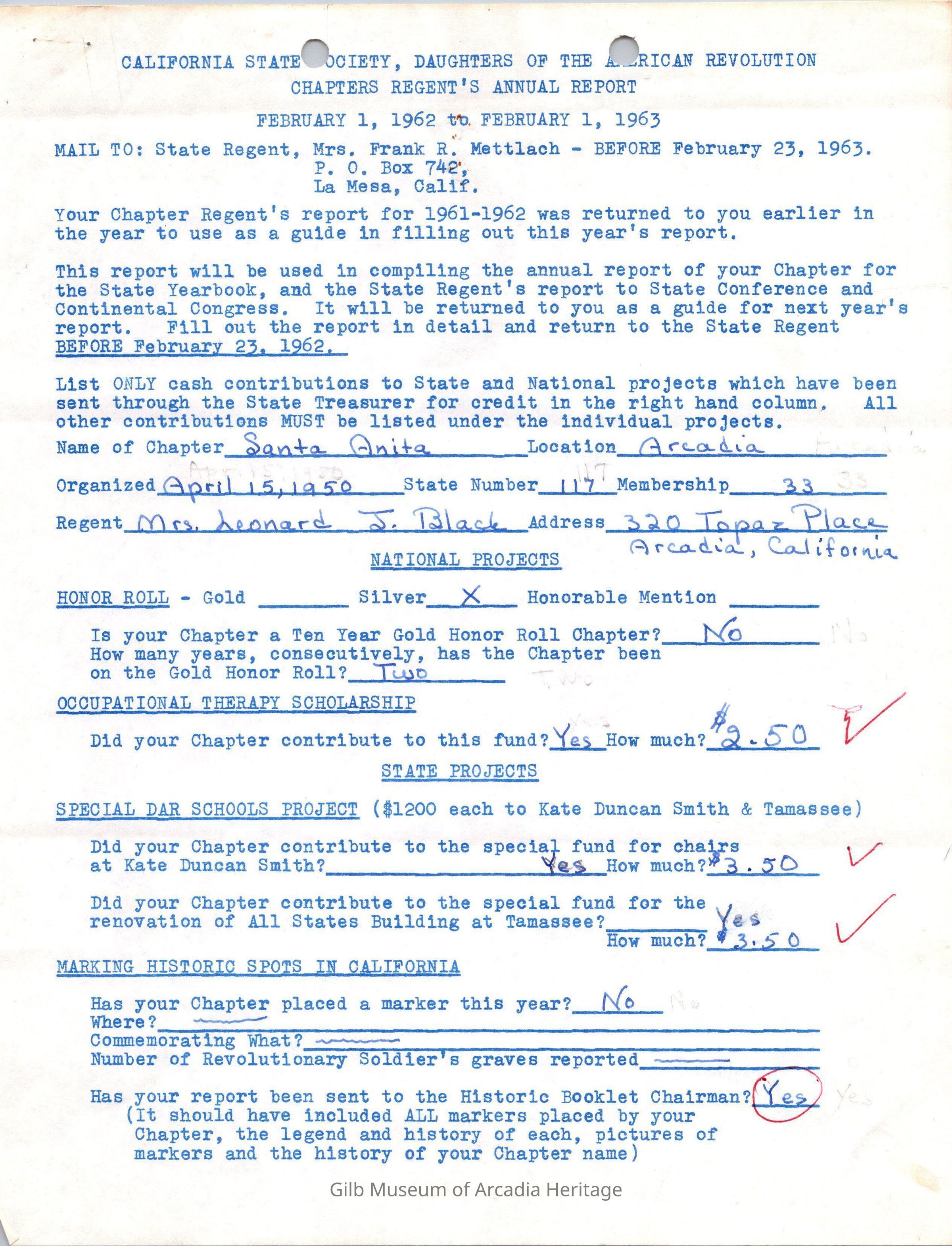 CSSDAR Chapter Regent's Annual Report for February 1,1962 to February 1,1963.