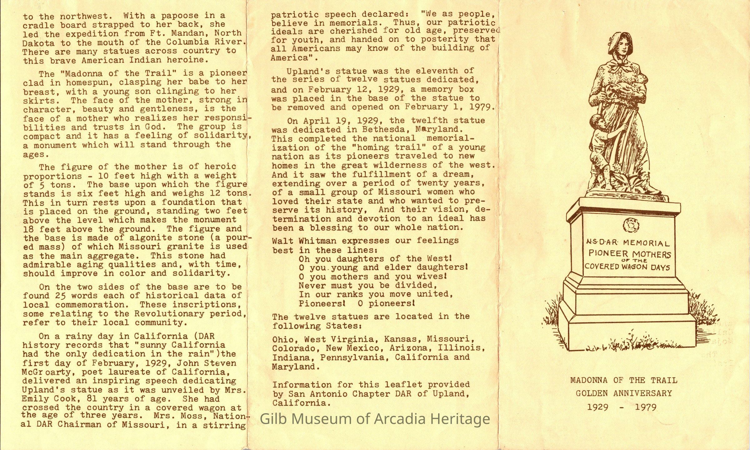 The Madonna of The Trail Monument Golden Anniversity Pamphlet 1929-1979Collection
